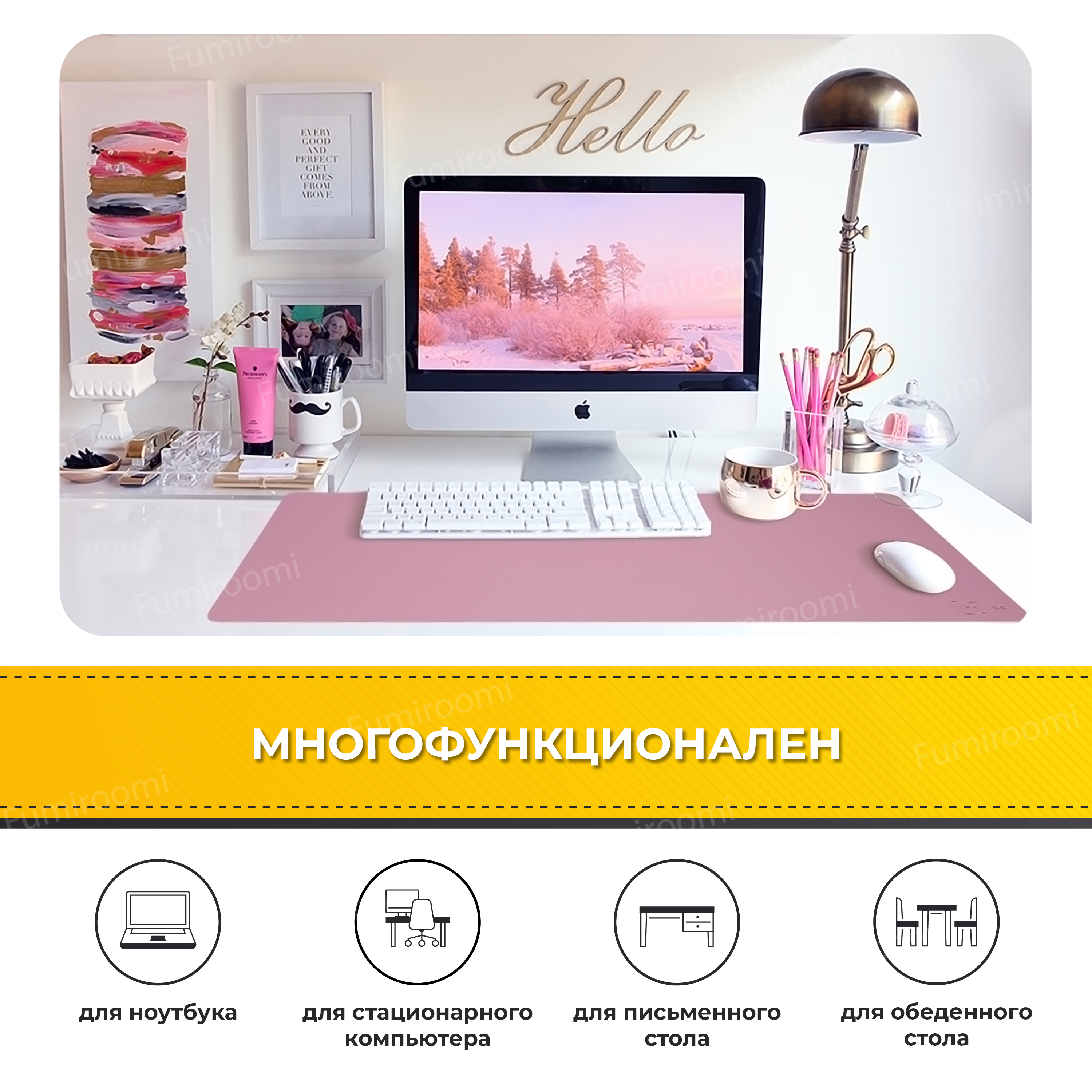 Описание: Многофункциональный настольный коврик для ноутбука и для компьютерной мыши. Защитит ваш стол от царапин, чернил, воды, потертостей, пятен горячей чашки. Визуально организует рабочее место дома или в офисе, на нем удобно писать.