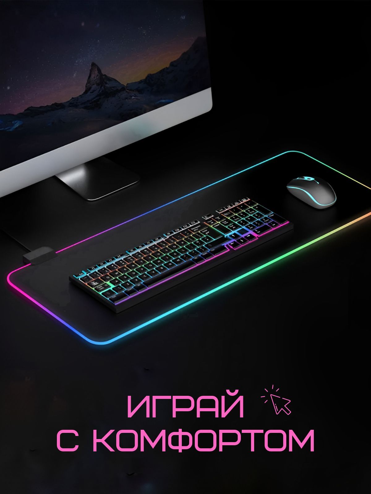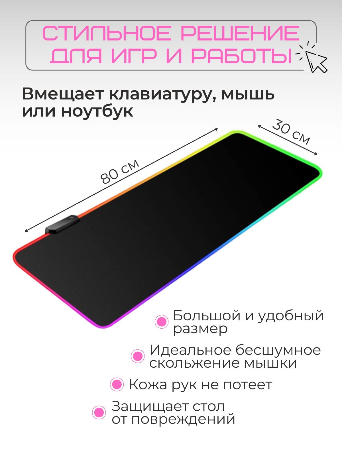 Описание: Коврик для мышки с RGB Led-подсветкой подходит для оптических и лазерных мышей с любой чувствительностью и любым типом сенсора. Гладкая поверхность и нескользящая каучуковая основа устойчива к различным загрязнениям, проста в уходе и надежно фиксируется на любой поверхности. Большой размер для удобной работы, коврик для мышки с функцией подсветки. Есть 14 режимов неоновой подсветки, Вы можете выбрать под свой вкус. Коврик для мыши с подсветкой имеет большой размер 800мм * 300мм. Коврик для мыши, для клавиатуры имеет гладкую тканевую поверхность премиум класса и нескользящая основа. Повышенная износостойкость. Края, усиленные оплеткой, не подвержены деформации. Выбор настоящих геймеров и ценителей качества. Коврик для мыши игровой будет оценено по достоинству и станет отличным подарком на день рождения, без повода, просто так, для тех, кого вы цените и любите, для сына, мужа, внуку, внучке, подруге, любимого человека, любителя компьютерных игр.