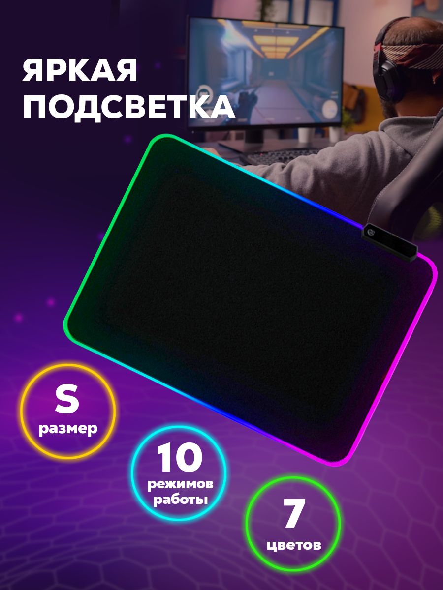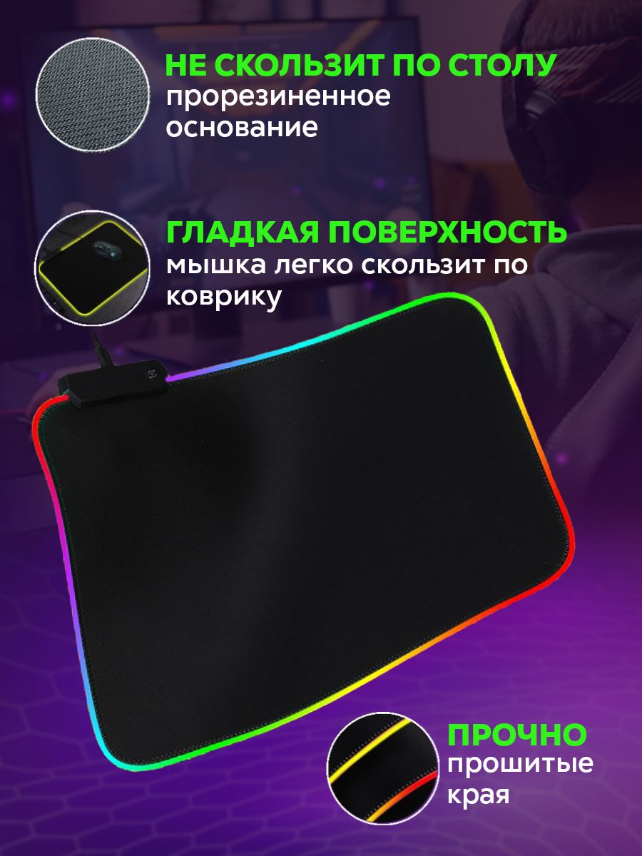 Размер игрового коврика для мыши подходит для любого компьютерного стола. Благодаря специальной поверхности обеспечивает максимальное скольжение мыши. Верхний слой игрового коврика для мыши с подсветкой выполнен из синтетического материала.