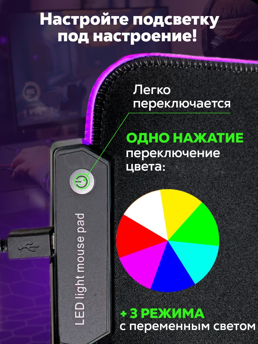 Описание: Коврик для мышки со светодиодный подходит для оптических и лазерных мышей с любой чувствительностью и любым типом сенсора. RGB-коврик для компьютерного стола повышает эргономичность рабочего места и облегчает управление курсором мыши.