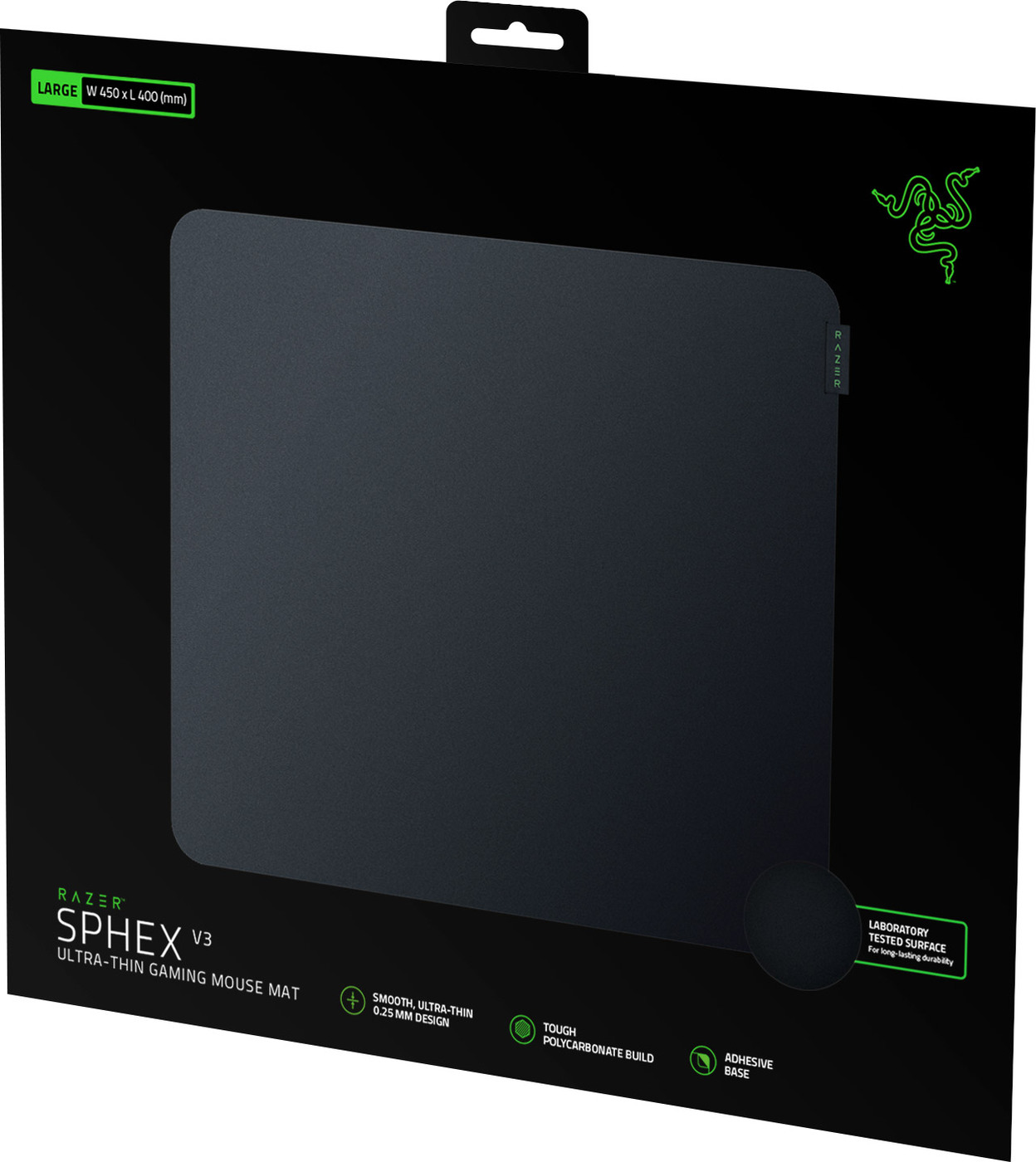 2. Обновленный с лаконичным черным дизайном и гладкой поверхностью, Sphex V3 на 50% больше стандартного Sphex V2.ЖЕСТКАЯ КОНСТРУКЦИЯ ИЗ ПОЛИКАРБОНАТАПротестированный в лабораториях, коврик для мыши демонстрирует невероятную прочность к ударам, разрывам и повреждениям. Razer Sphex V3 хорошо оснащен для долгих часов напряженных соревновательных игр.КЛЕЙКОЕ ОСНОВАНИЕКлейкое основание коврика для игровой мыши помогает ему оставаться на месте даже во время самых интенсивных тренировок, однако его также достаточно легко удалить, не оставляя липких следов на вашем столе.