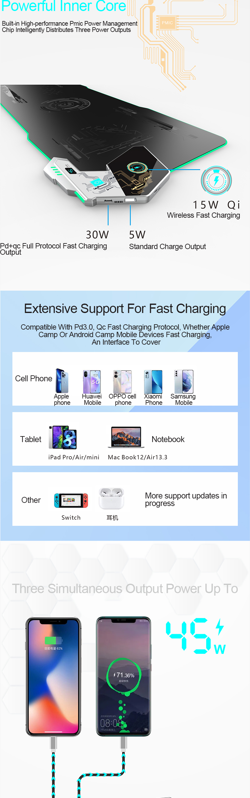 【 45 Вт зарядка мышь Mat】 встроенный 15 Вт Беспроводная быстрая зарядка, И два выходных порта общей выходной мощности 45 Вт совместимы со смартфонами, которые поддерживают беспроводную зарядку, такую как iPhone 8/X/XR/XS/11/11 Pro, Samsung Galaxy 10/S9/S8 Plus, galaxy Note 9/8 и все другие устройства с поддержкой Qi. 3 режима зарядки-красный для зарядки, зеленый для полной зарядки, синий для режима ожидания. (Примечание: 15 Вт требуется адаптер питания 9 В 2 А, но адаптер питания не входит в комплект поставки этой коврик для мыши)
