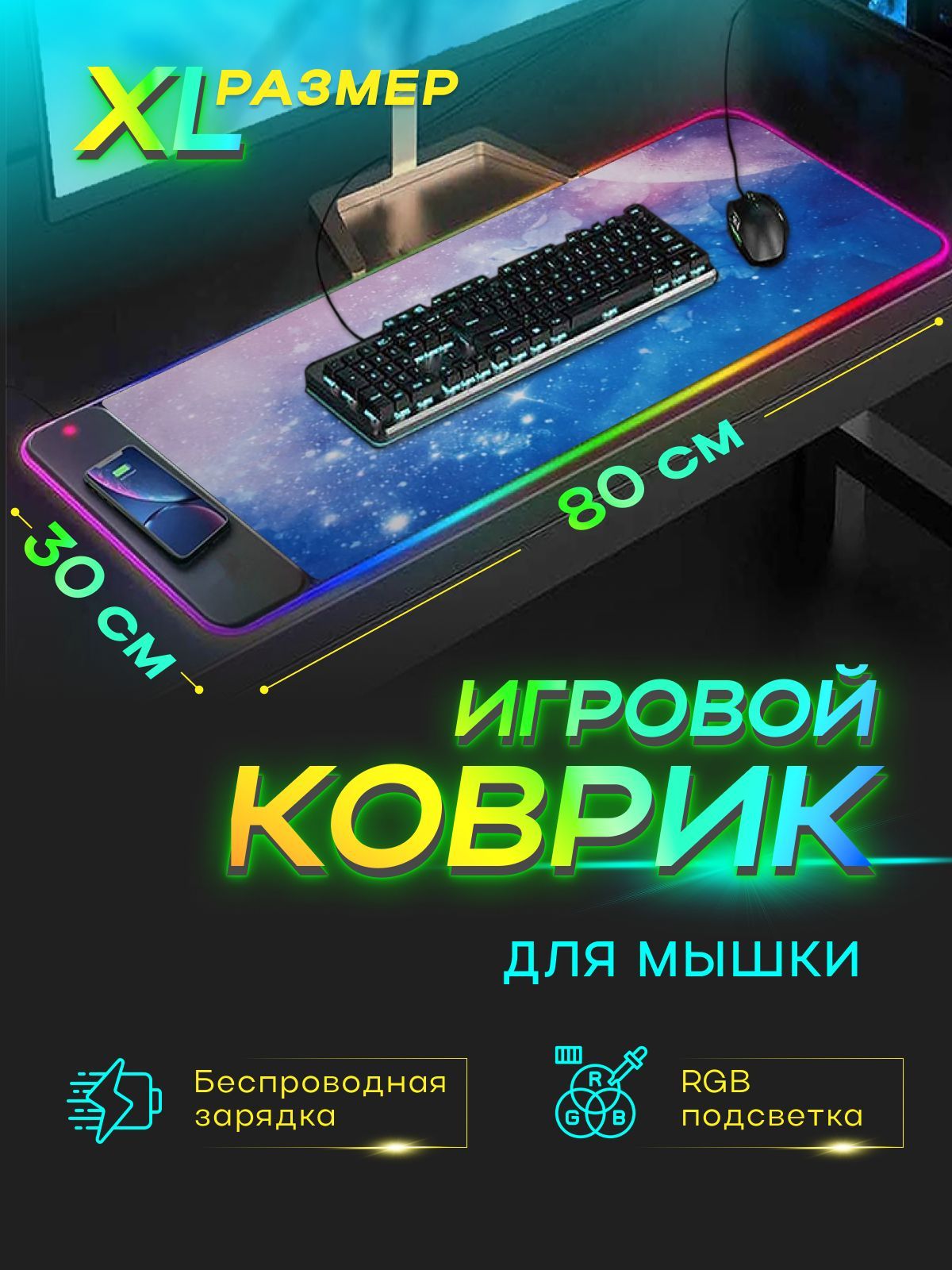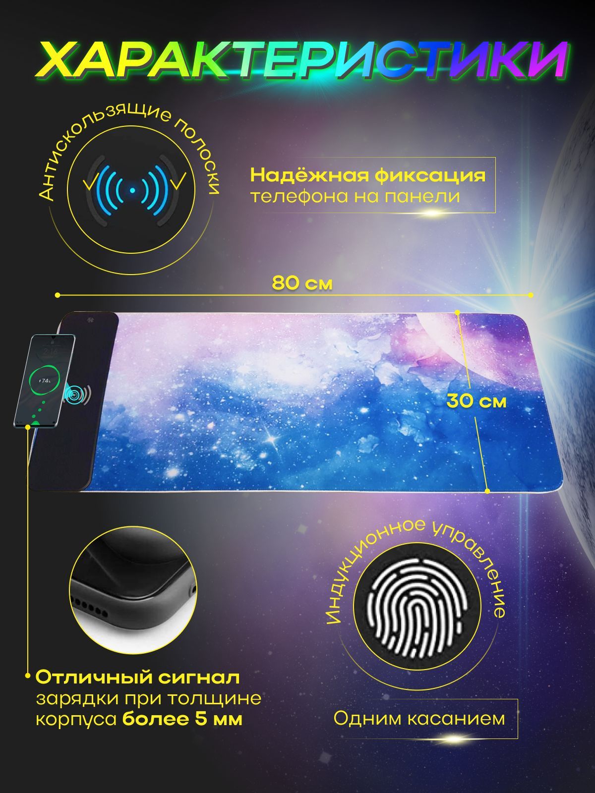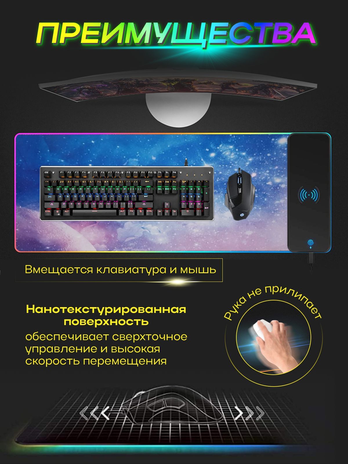 Большой игровой коврик для мышки и клавиатуры с беспроводной зарядкой и подсветкой обеспечит идеальную работу и создаст стильную и уютную атмосферу в рабочей зоне, благодаря подсветке коврика и беспроводной зарядке телефона.