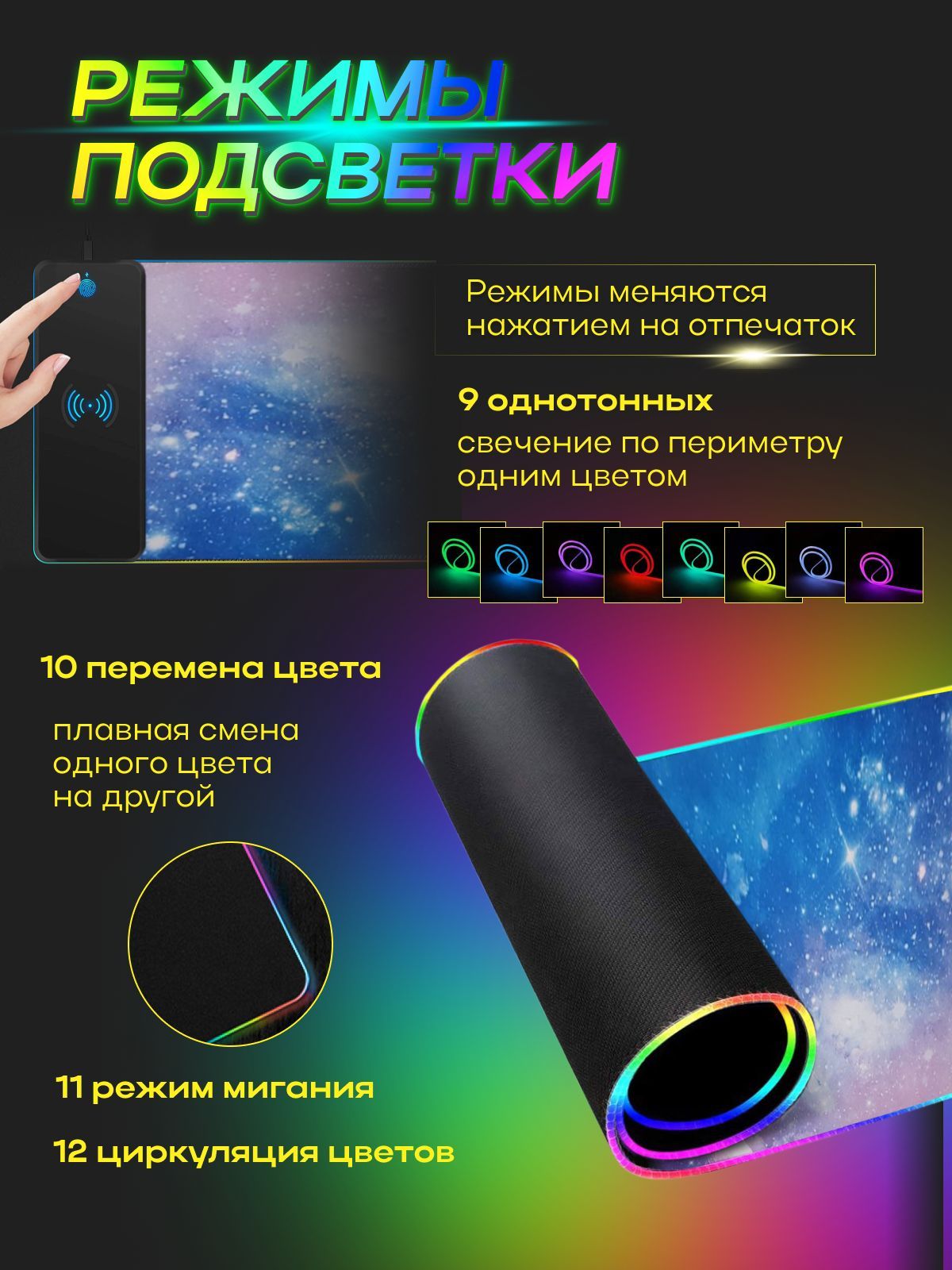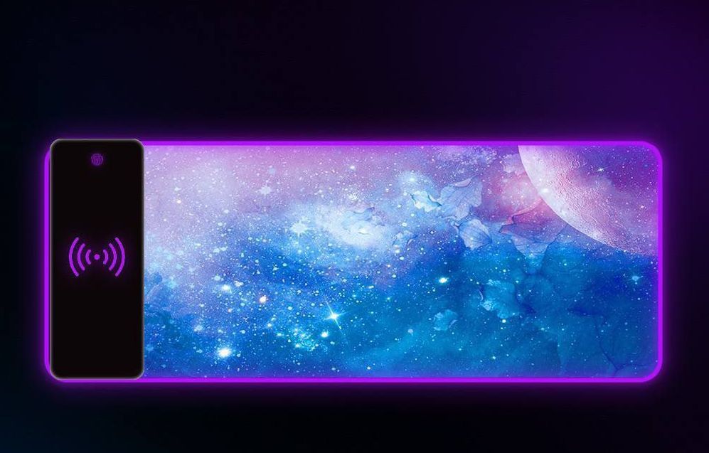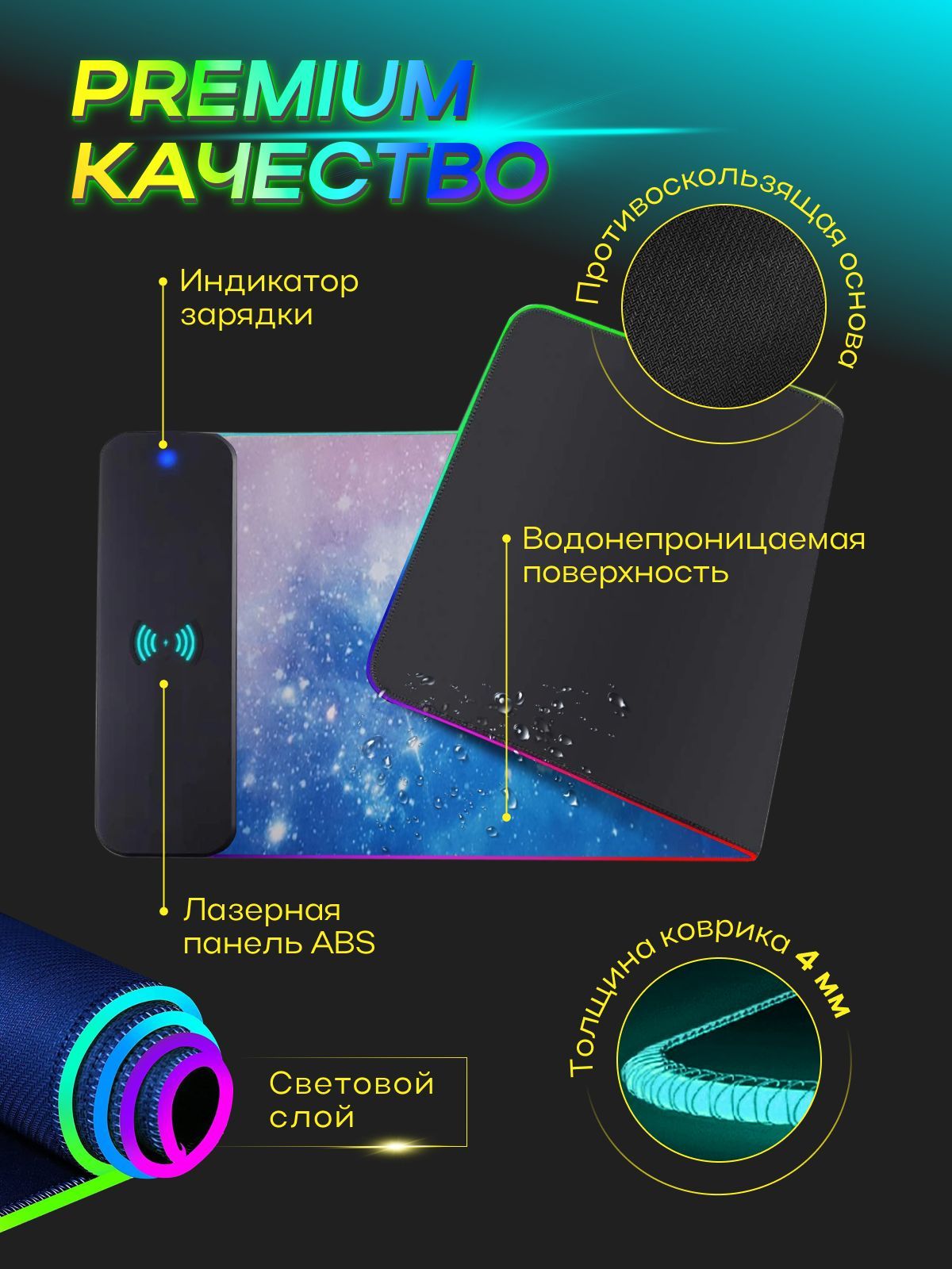 Большой игровой коврик для мышки и клавиатуры с беспроводной зарядкой и подсветкой обеспечит идеальную работу и создаст стильную и уютную атмосферу в рабочей зоне, благодаря подсветке коврика и беспроводной зарядке телефона.