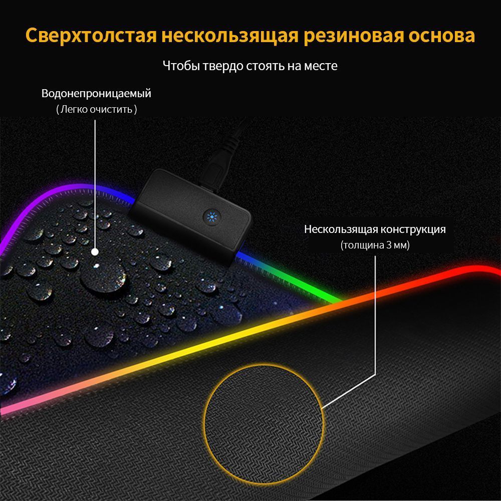 Особенности коврика: Водоотталкивающая поверхность, Прошитые края, Подсветка, Нескользящая основа