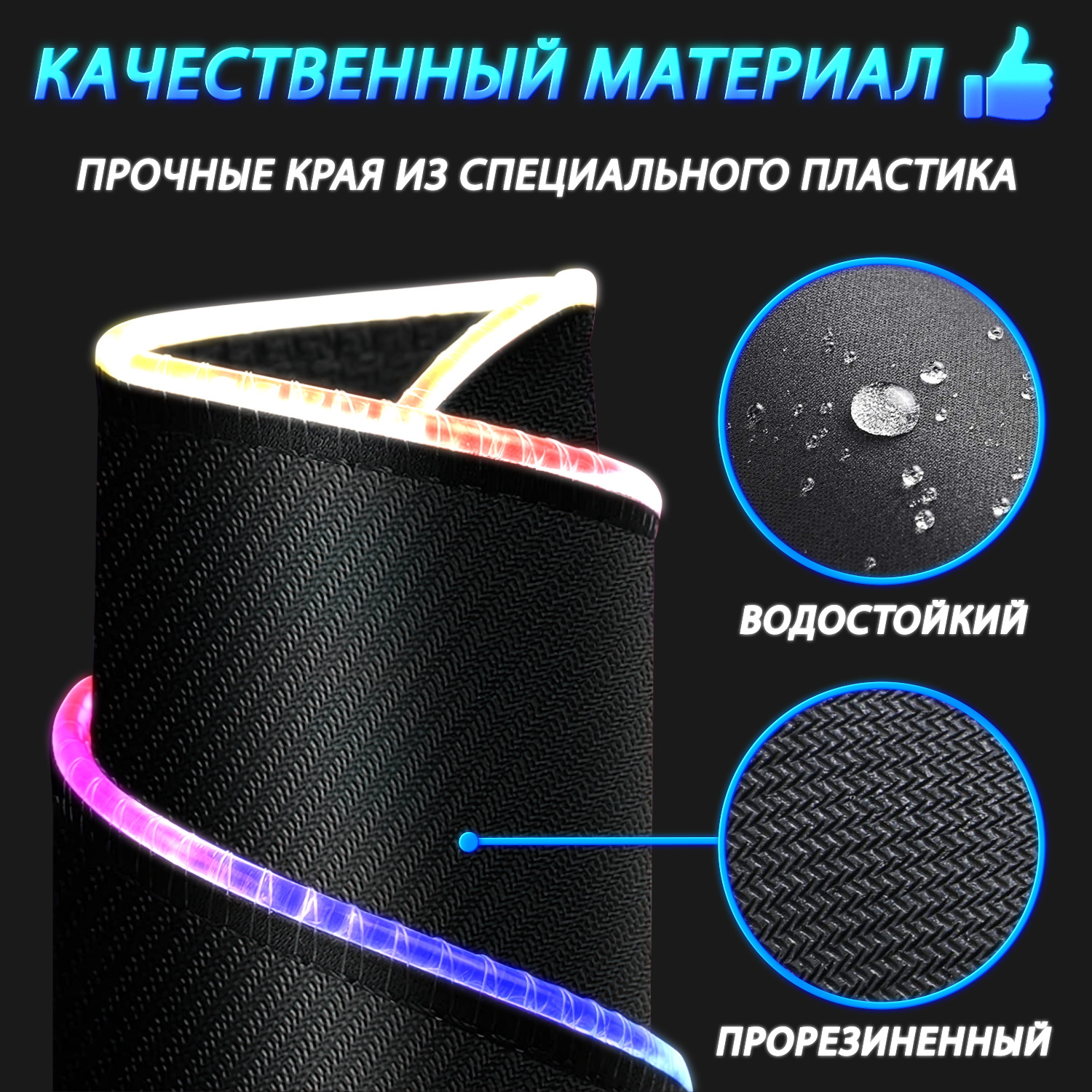 Особенности коврика: Водоотталкивающая поверхность, Нескользящая основа, Подсветка, Прошитые края