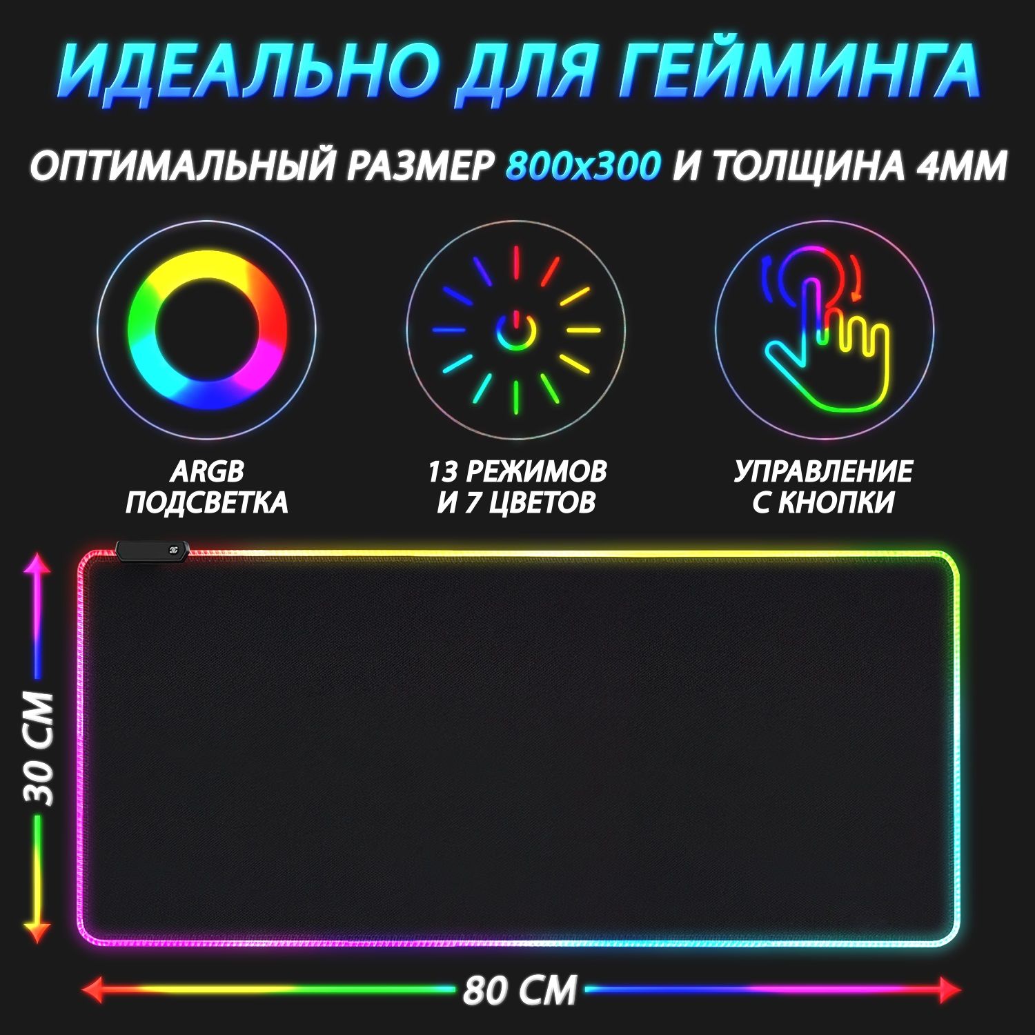 Игровой коврик для мышки большой с подсветкой RGB компьютерный, огромный ковер РГБ на весь стол для мыши, клавиатуры, офиса, светящийся led ARGB, тканевый, гладкий, 800x300x4мм, черный