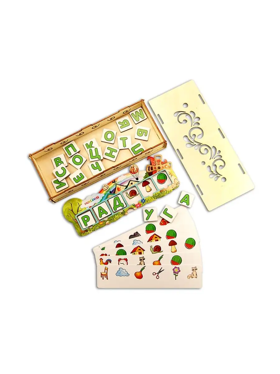 Комплектация рамка вкладыш; Деревянные буквы; коробка; карточки с заданием
