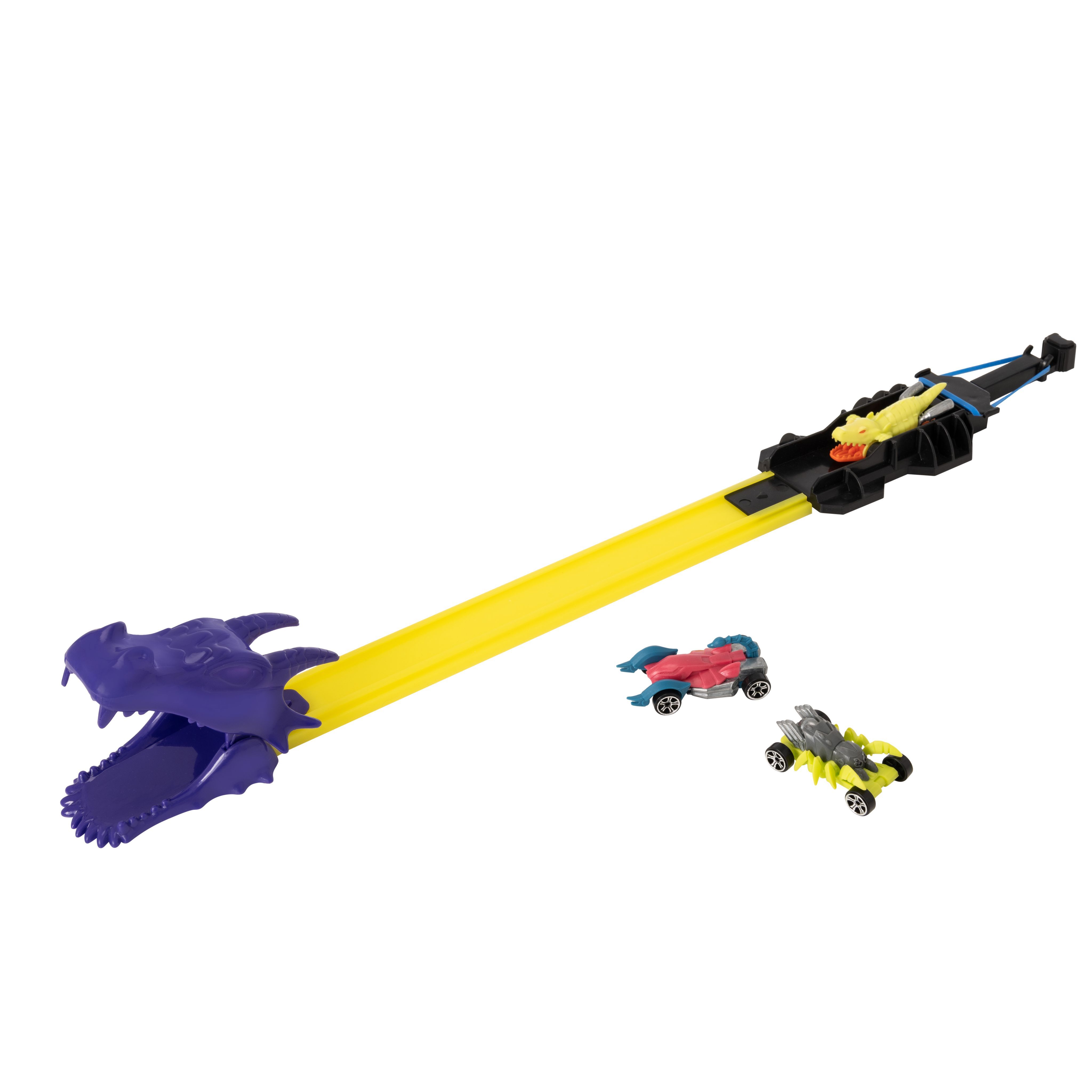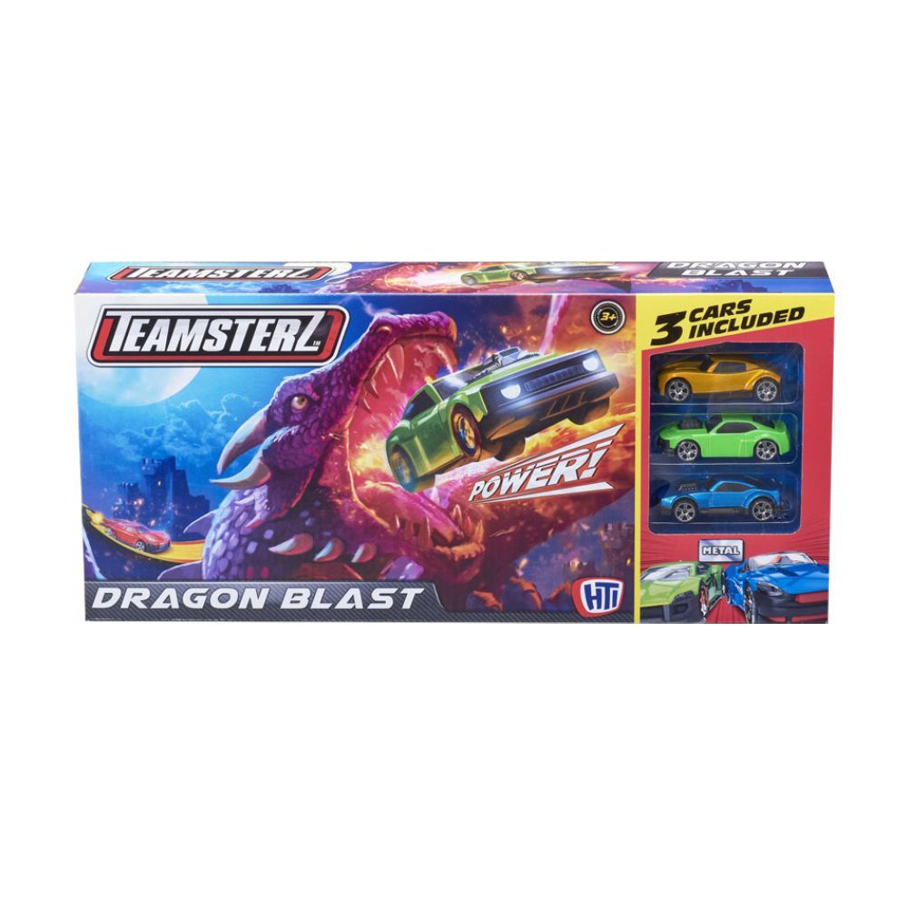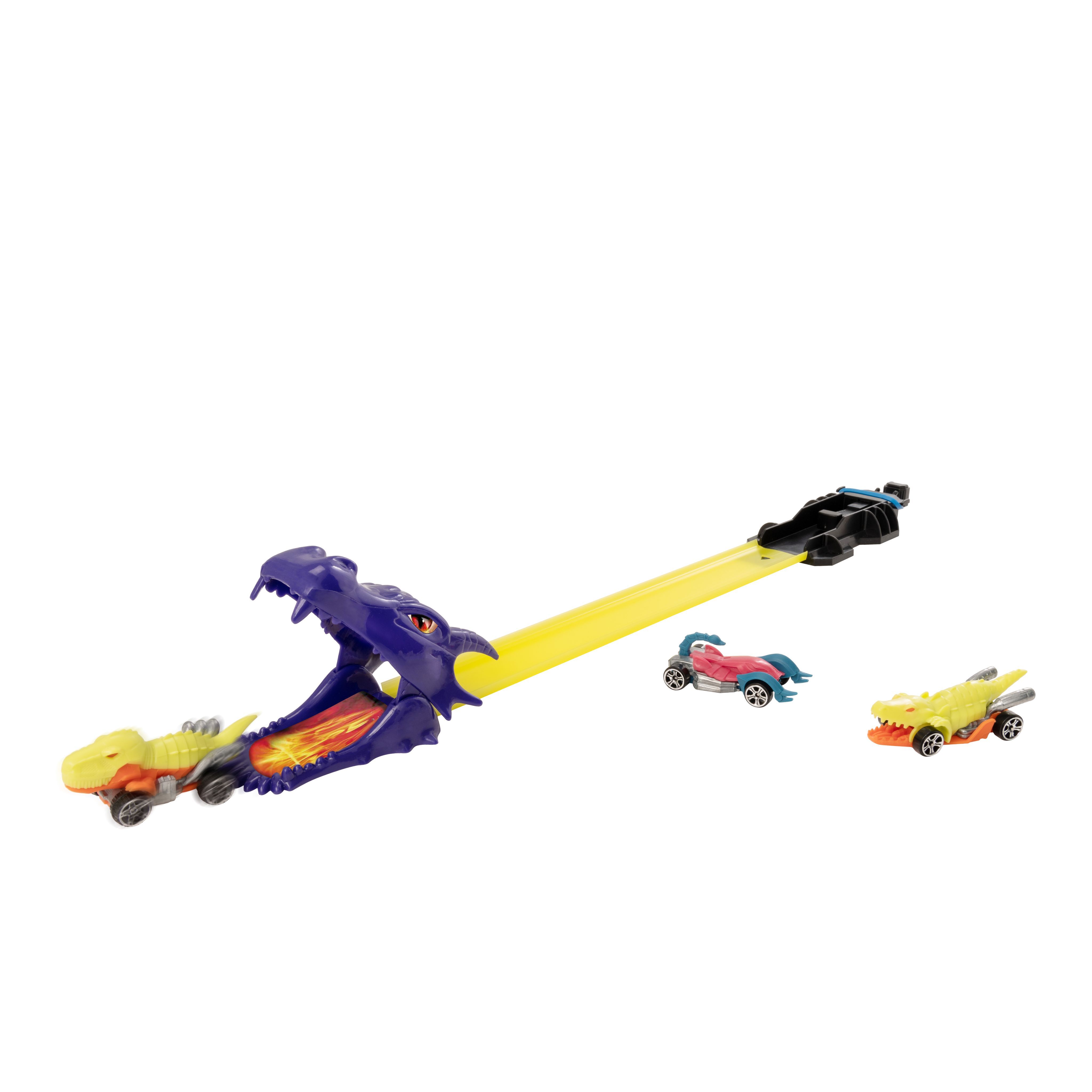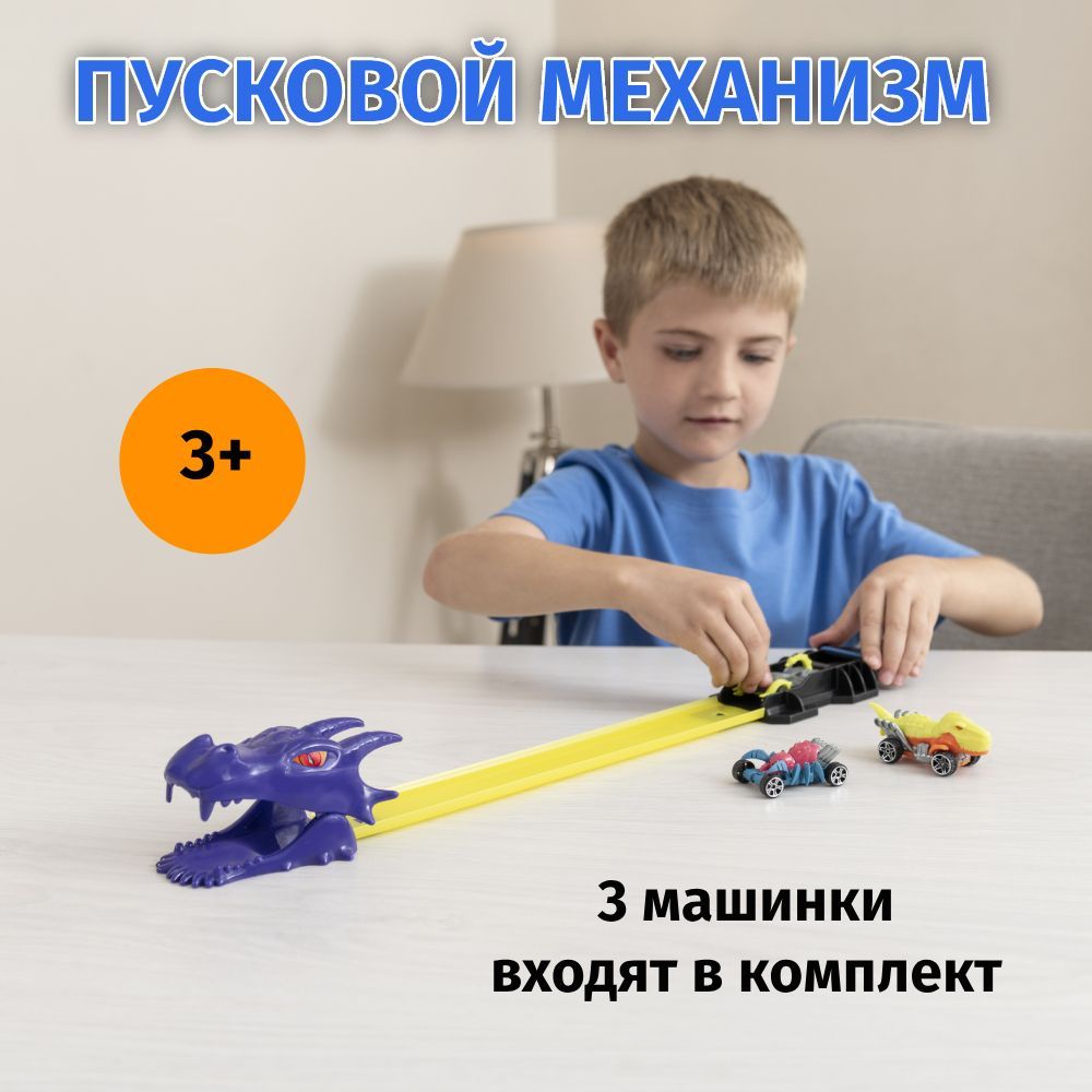 Этот набор включает в себя трек длиной 53 см из прочного пластика, который просто собирается и разбирается. На старте трассы есть пусковой механизм для скоростного запуска. В завершении прохождения трека машинку ожидает препятствие в виде пасти дракона. Набор включает в себя 3 яркие и разноцветные металлические машинки размером 3 дюйма (в ассортименте, могут отличаться от представленных на фото), каждая со своим собственным дизайном. Машинки изготовлены из качественного металла и пластика, легко едут по трассе.