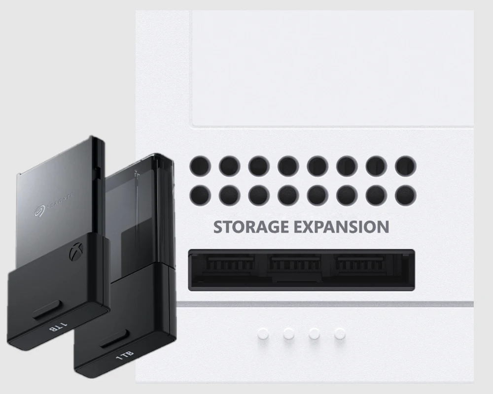 Карта расширения памяти Seagate для Xbox Series X|S подключается к задней панели консоли через выделенный разъем расширения хранилища и воспроизводит работу встроенного специализированного твердотельного накопителя консоли, обеспечивая дополнительное игровое хранилище и сохраняя производительность. (Продается отдельно, доступно в различных размерах.)