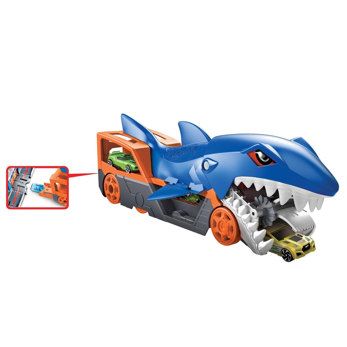 Культовый автомобиль Shark Bite от Hot Wheels теперь представлен в виде шикарного грузовика под названием Голодная акула! Когда грузовик движется вперед, акула захватывает машинки своими челюстями и проглатывает их. Машинки хранятся в животе чудовища, а выгрузить их можно через заднюю часть грузовика с помощью пандуса. Дети будут с восторгом наводить порядок, наблюдая, как миниатюрные машинки скрываются в огромной пасти (дополнительные машинки продаются отдельно).