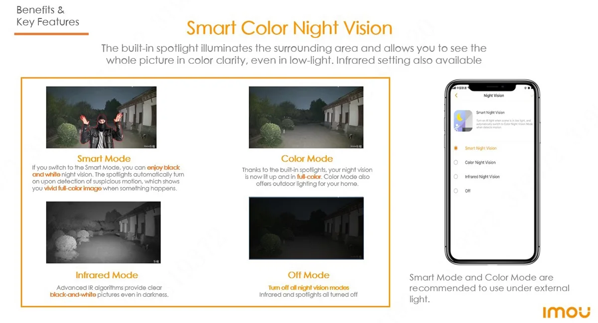 Встроенный прожектор освещает окрестности и позволяет видеть всю картину в полном цвете даже при слабом освещении.