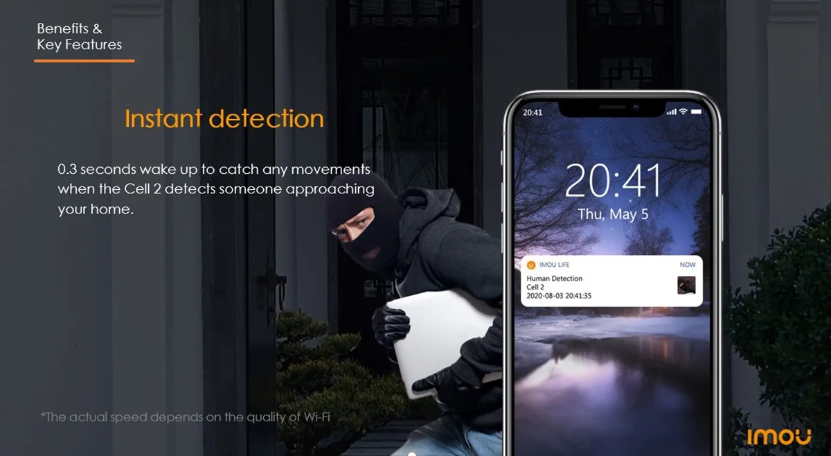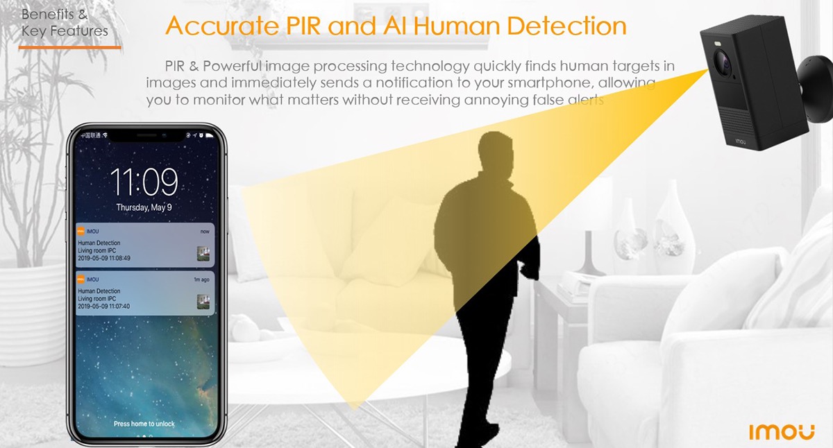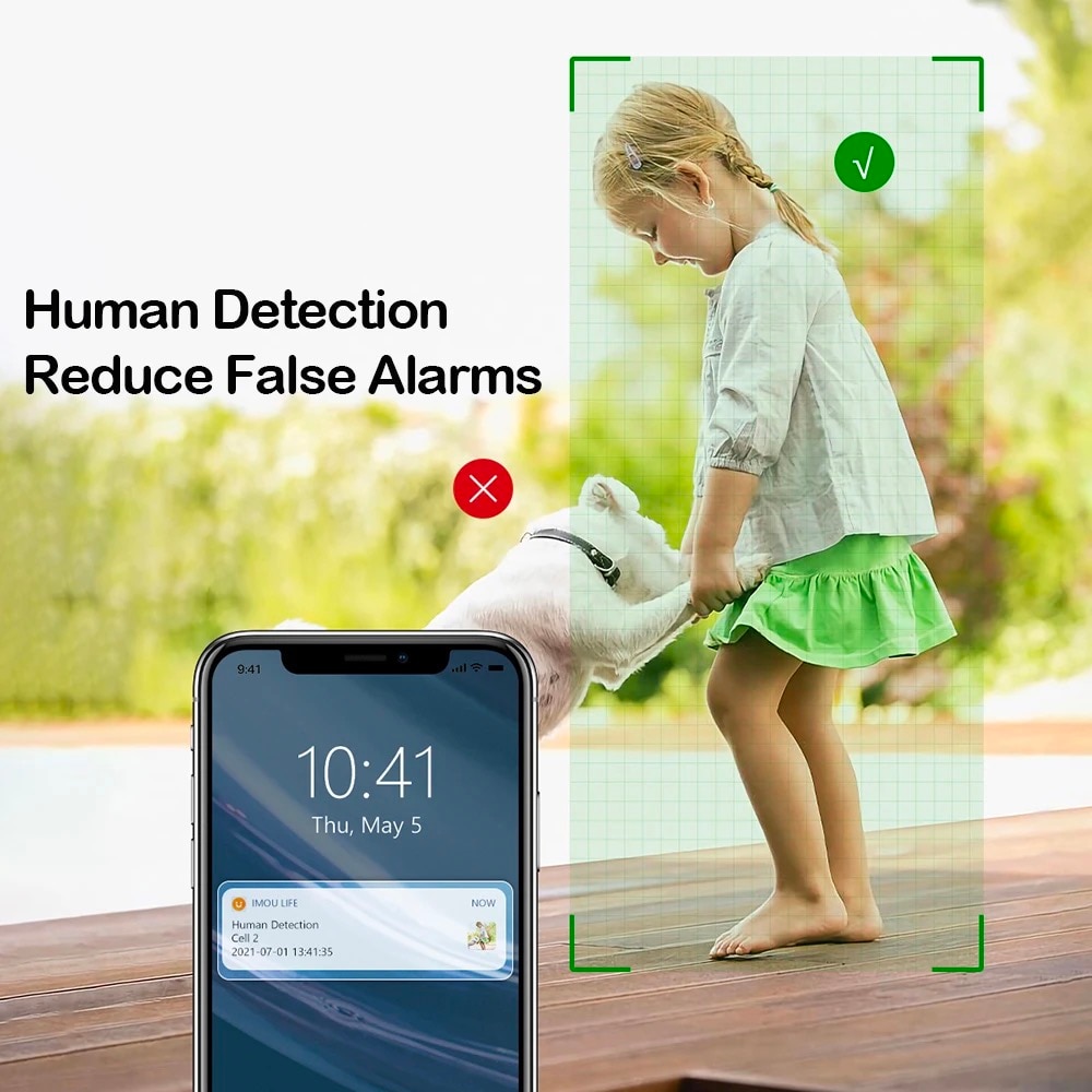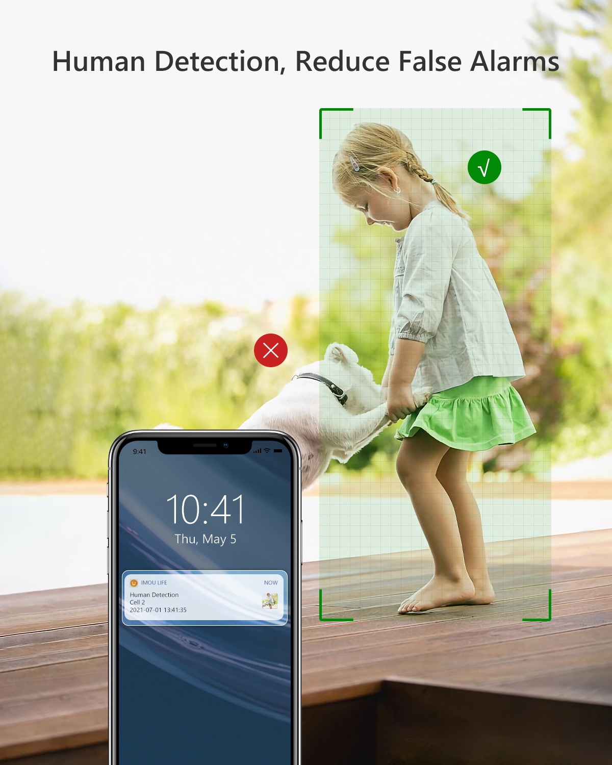 PIR и мощная технология обработки изображений точно идентифицирует человеческие цели в потоковой передаче, отправляет мгновенное Оповещение на ваш телефон