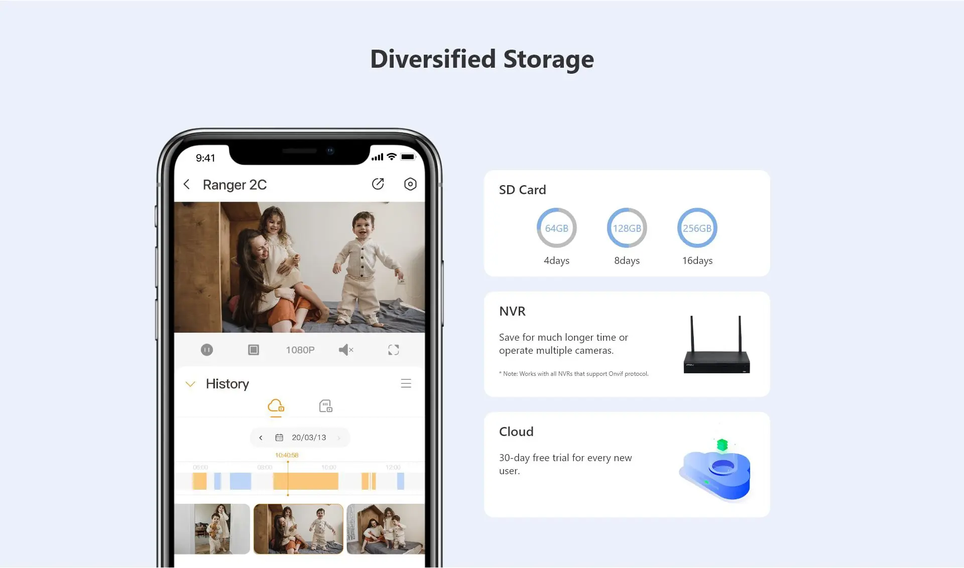 Видео легко хранится и доступно через SD-карту, сетевой видеорегистратор или Облачное хранилище.