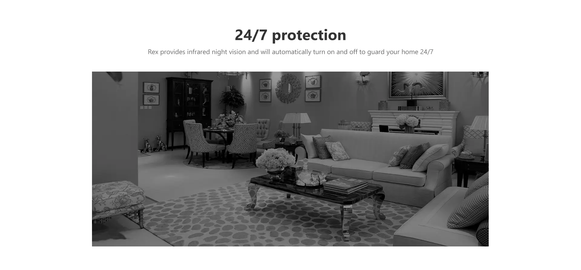 Rex обеспечивает инфракрасное ночное видение и автоматически включается и выключается, чтобы охранять ваш дом 24/7.