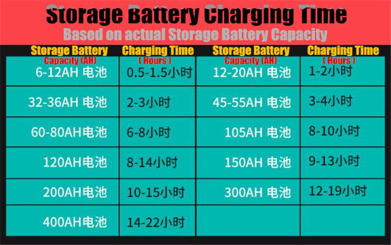 Для аккумуляторных батарей менее 100 Ач или больше время режима зарядки постоянным током будет немного больше на начальном этапе, процент отображения зарядного устройства будет отложен, дождитесь режима постоянного напряжения, режим непрерывной зарядки будет сокращен, Процент заряда зарядного устройства в это время Дисплей ускорится и не повлияет на эффект зарядки.