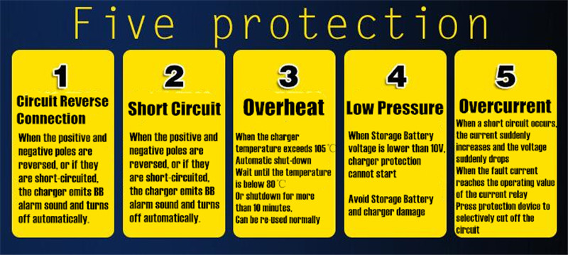 Five-fold protection function Circuit reverse connect,Short circuit,Low pressure,Overheat,Overcurren