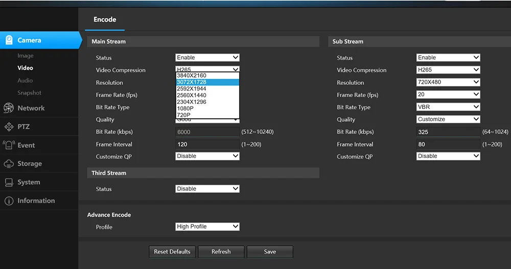 Основной поток: 3840x2160,3072x1728,2592x1944,2560x1440,2304x1296,1080P, можно установить 720P