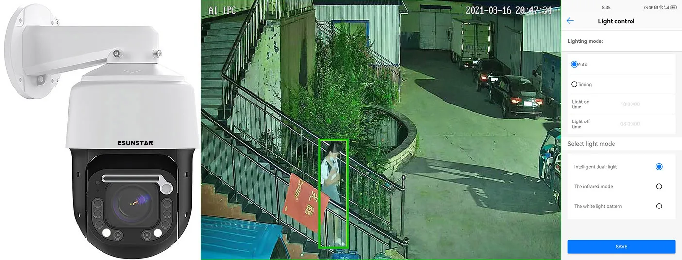 Это Совершенно новая многофункциональная интеллектуальная высокоскоростная купольная IP-камера с искусственным интеллектом PTZ, выпущенная ESUNSTAR. Он оснащен объективом высокой четкости с 30-кратным оптическим зумом и поддерживает 10-кратный цифровой зум, что позволяет достичь истинной камеры с 300-кратным зумом. Камера поддерживает горизонтальное и неограниченное вращение на 360 °, что позволяет обеспечить 7*24 часа непрерывного отслеживания и круиза. Оснащенный 10 мощными светодиодными лампами, он может достигать расстояния инфракрасного ночного видения 150 метров в ночное время и обеспечивать полноцветное ночное видение 50 метров. Богатое интеллектуальное Программирование AI может соответствовать мониторингу в большинстве сценариев приложений и по-настоящему реализовывать многорежимный, многоугольный и многорисценарный видеомониторинг. Все функции можно настроить. Эта камера поддерживает несколько протоколов подключения и полностью совместима с вашим сетевым видеорегистратором и сторонними программными платформами для управления. Поддержка ONVIF, Протокола Hikvision, Протокола RTSP, Протокола RTMP и т. Д. И поддержка подключения POE IEEE802.3AT (1236/4578).