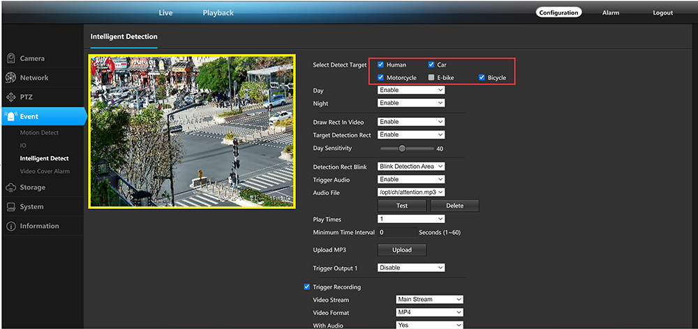 Поддержка обнаружения движения, обнаружения человека, автомобиля, мотоцикла и велосипеда