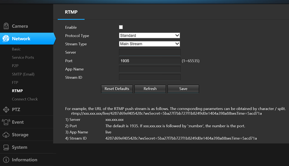 Формат URL RTSP для камер серии AJ выглядит следующим образом (при условии, что IPC IP 192.168.0.123):