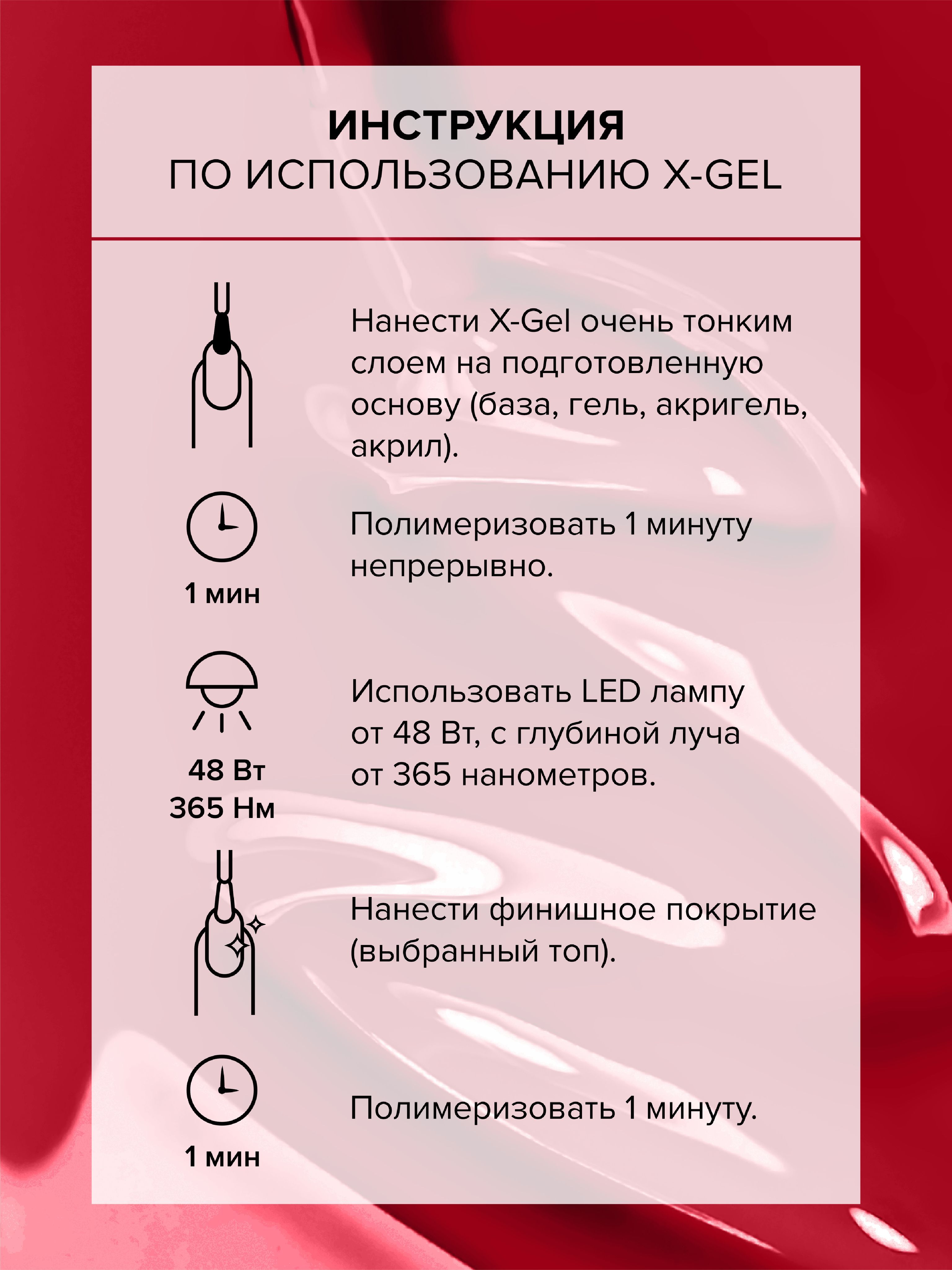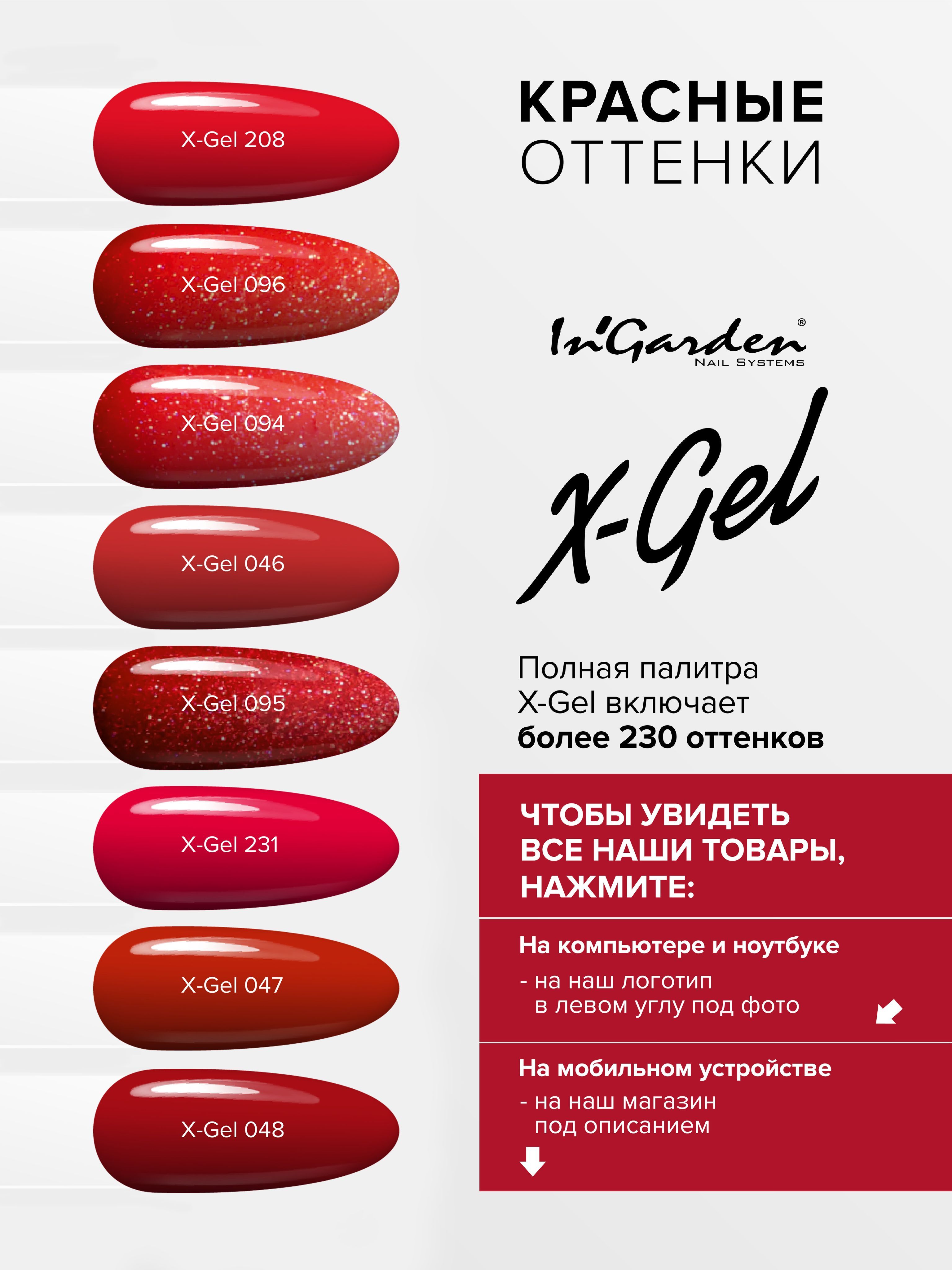 Основным преимуществом гель-лаков In'Garden X-gel является время их нанесения, так как благодаря использованию лучших пигментов в составе, этот материал позволяет делать покрытие всего в один слой и самовыравнивается! Важной особенностью In'Garden X-gel является отсутствие неприятного запаха, что несомненно делает работу еще более комфортной как для мастера, так и для клиента. Гель-лаки In'Garden Икс-гель (X-gel) - это: