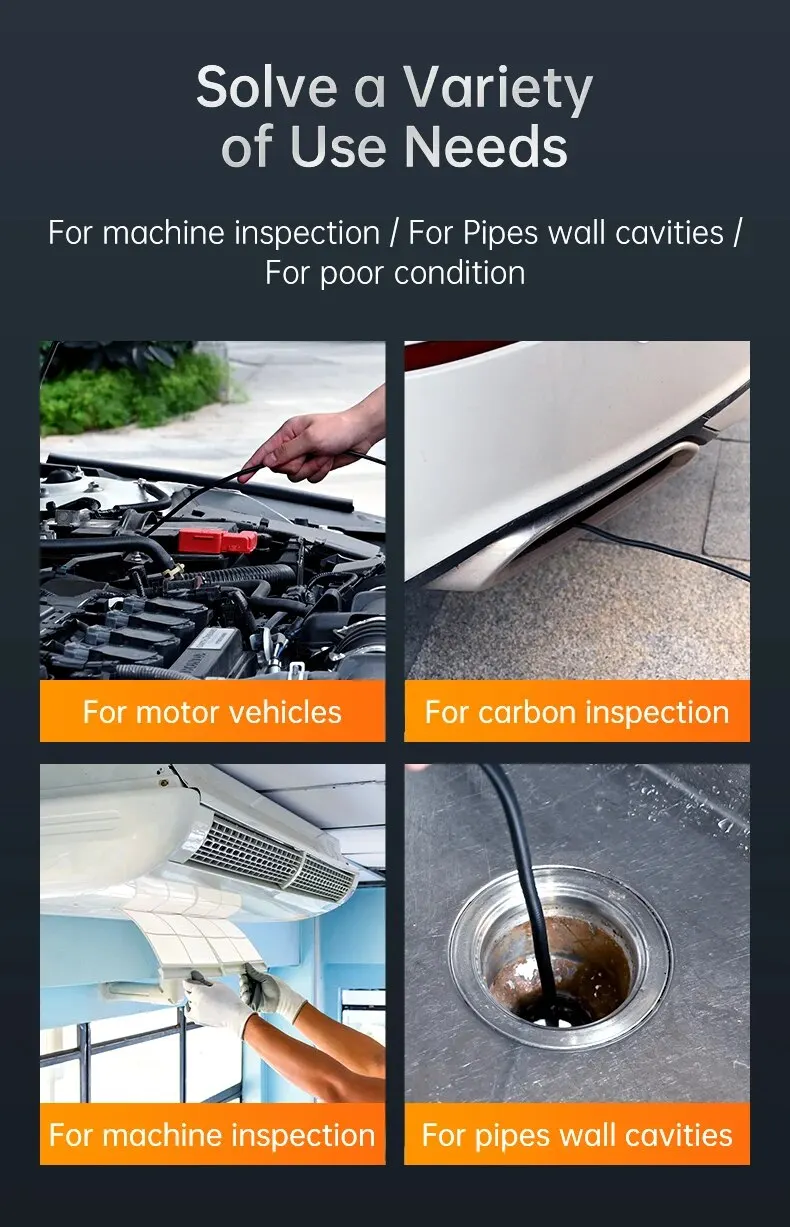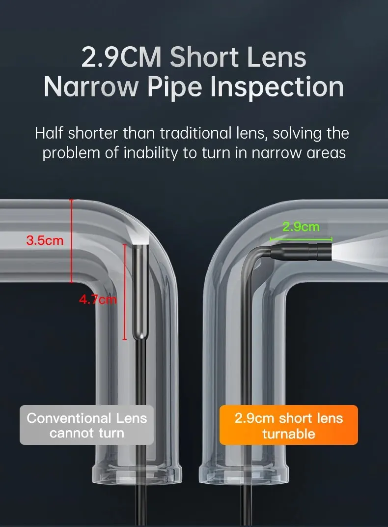 • Конструкция с одним объективом:Конструкция этой эндоскопической камеры с одной линзой позволяет легко маневрировать в ограниченном пространстве и обеспечивает более широкое поле зрения, что делает ее идеальной для проверки автомобильной канализации и других труднодоступных мест.