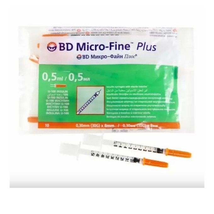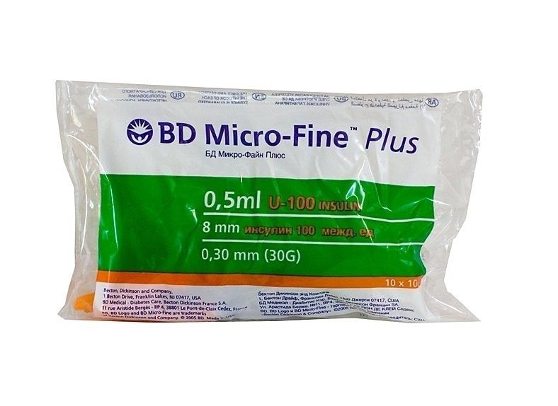Инсулиновый шприц 0,5 мл с интегрированной иглой U100 BD Micro-Fine Plus 30G 0,3 x 8 мм, Becton Dickinson, 100 штук