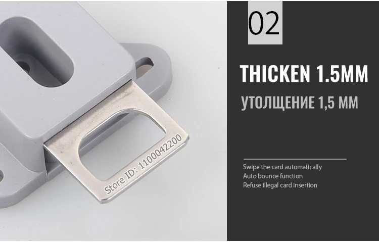 Используйте удостоверение личности, чтобы коснуться снаружи шкафа, он щелкнет замком и откроет дверь (Примечание: бирку можно использовать только для двери толщиной до 2,5 см, удостоверение личности можно использовать для двери толщиной до 4,5 см).