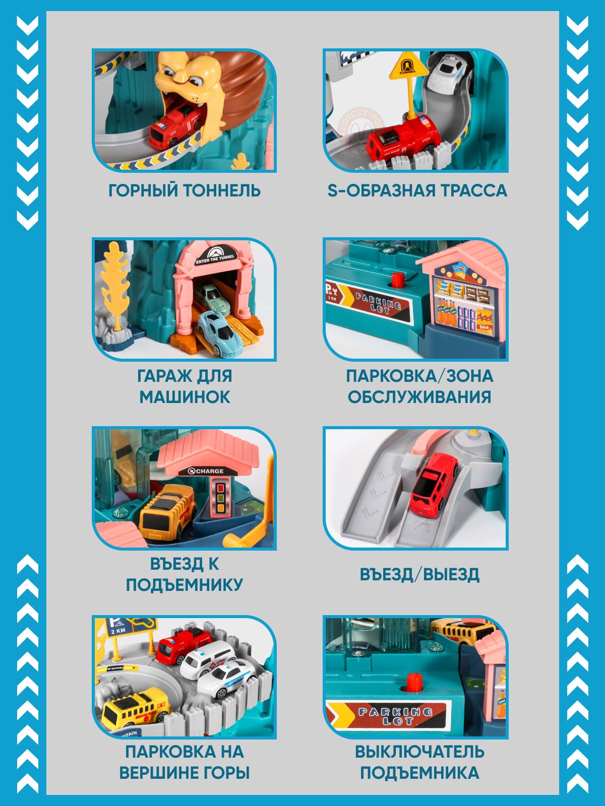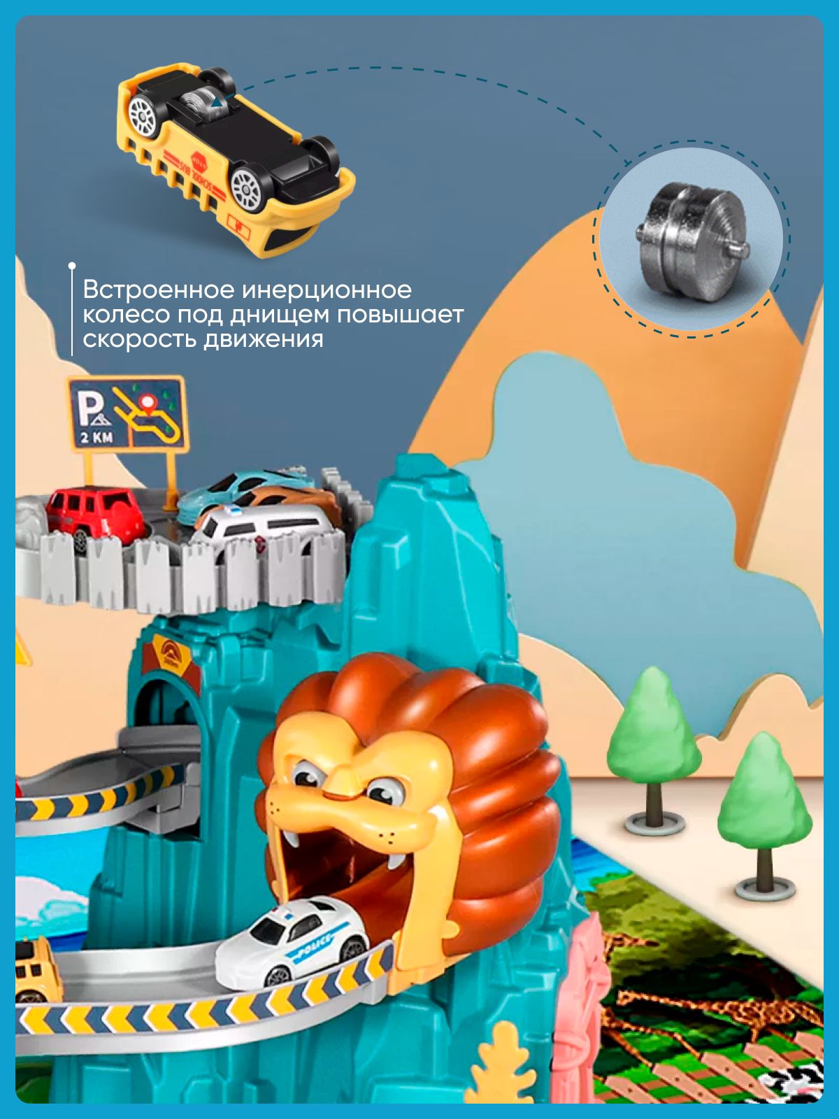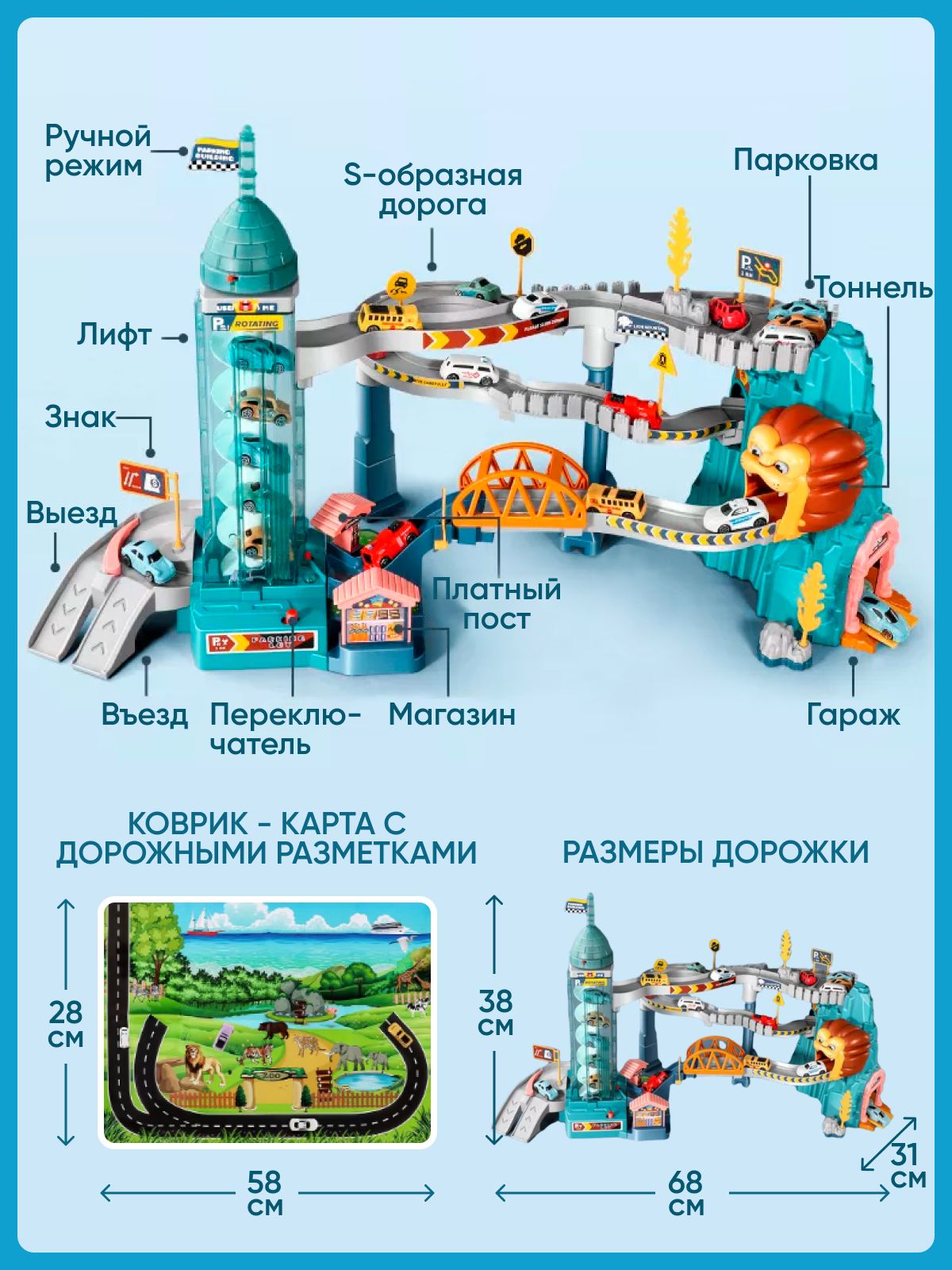 Описание: Интерактивная игрушка большой игрушечный гоночный автотрек с машинками, динозавром, эскалатором и звуком от бренда TrendToys - это интересная интерактивная игрушка! Игровой набор трек с машинками для мальчиков и девочек Лев или Динозавр включает в себя многоуровневый автотрек (гоночная трасса), автопарк на 4 машинки игрушки, тоннель, динозавр или лев, игрушечная парковка для машинок (паркинг), гараж для машинок, магазин, знаки и наклейки. Эскалатор на батарейках автоматически поднимает автомобиль на гоночный трек и запускает по кругу, как хот вилс. Включите звук и услышите крик динозавра или льва, включение двигателя, клаксон и шум езды. Конструктор из 18 частей, детали легко собираются и надежно стыкуются, а игрушечные машинки устойчивы к повреждениям. Сборка развивает мелкую моторику, логику и пространственное мышление. Развивающие детские игрушки Монтессори изготовлены из качественного abs пластика и безопасны для малышей. Игровой трек с машинками - это отличный подарок для мальчиков и девочек от 3 лет. Вес 1,5 кг. Соответствует требованиям безопасности ТР ТС 008/2011. 3 батарейки АА в комплект не входят.