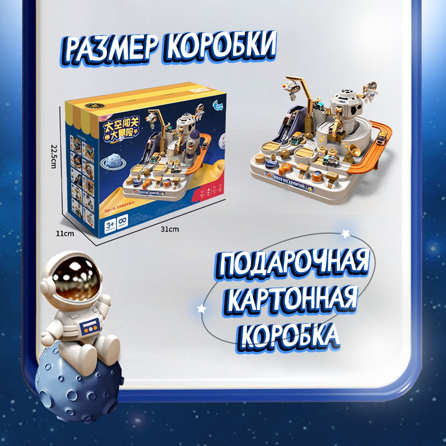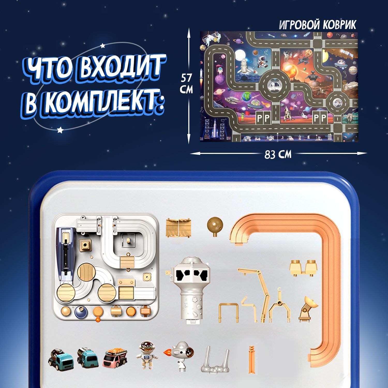 В комплект также входит игровой коврик, размером 83 см х 57 см, на котором ребёнок сможет разместить игровой трек, а также построить целый космический мир с машинками, передвигающимися по его трассам.