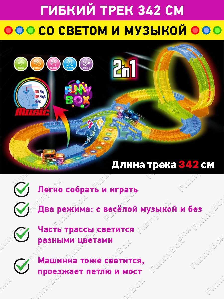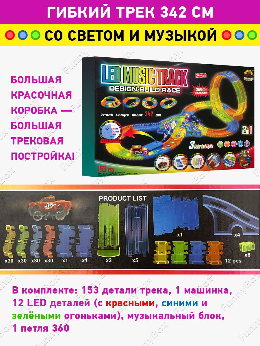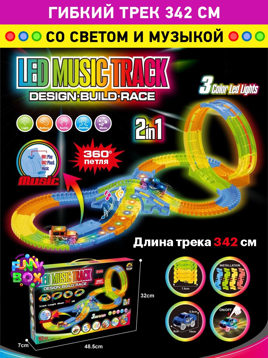 Описание: Световая музыкальная гибкая дорога - гибкий трек Led Music Track с машинкой. Помогите ребенку развивать свою креативность с новой гоночной трассой Led Music Track, которая изгибается в разные стороны и светится в темноте!