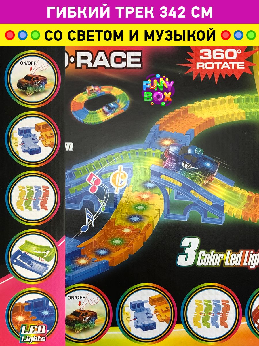 Светодиодные огни гоночного автомобиля освещают дорожку во время движения. Часть дорожки гибкого автотрека также оснащена разноцветными светодиодами - то есть переливается разными огнями.