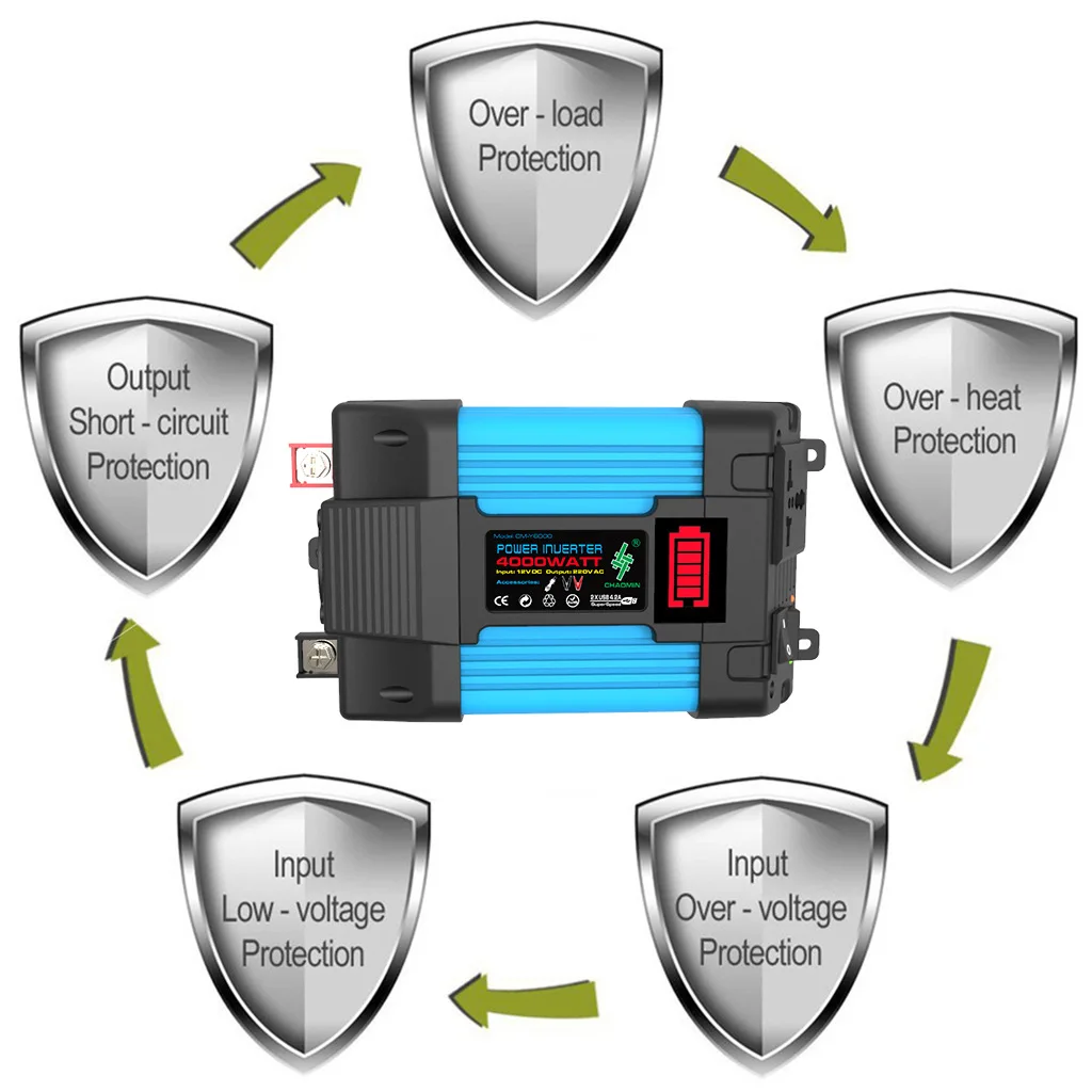[Multi Protection] Встроенные предохранители, безопасная конструкция зарядки и охлаждающий вентилятор предотвращают перегрев автомобильного преобразователя питания, экономя электроэнергию и энергию. Защита от перенапряжения, перегрузки, перегрузки по току, короткого замыкания, пониженного напряжения, перегрева, короткого замыкания.