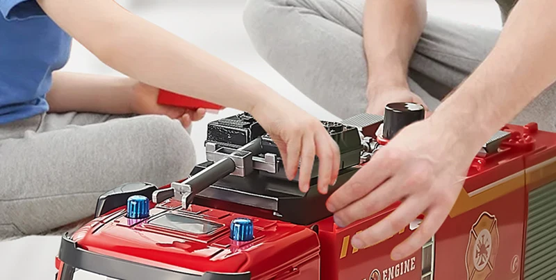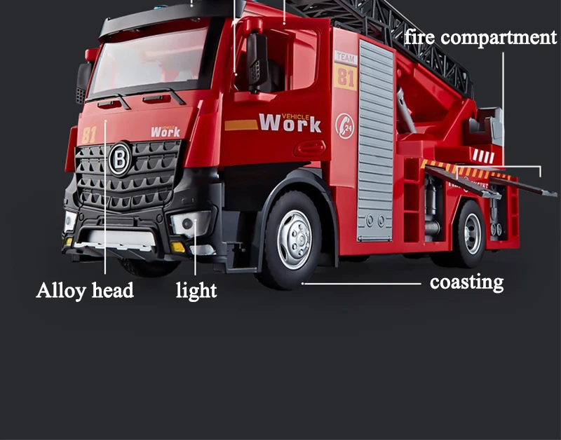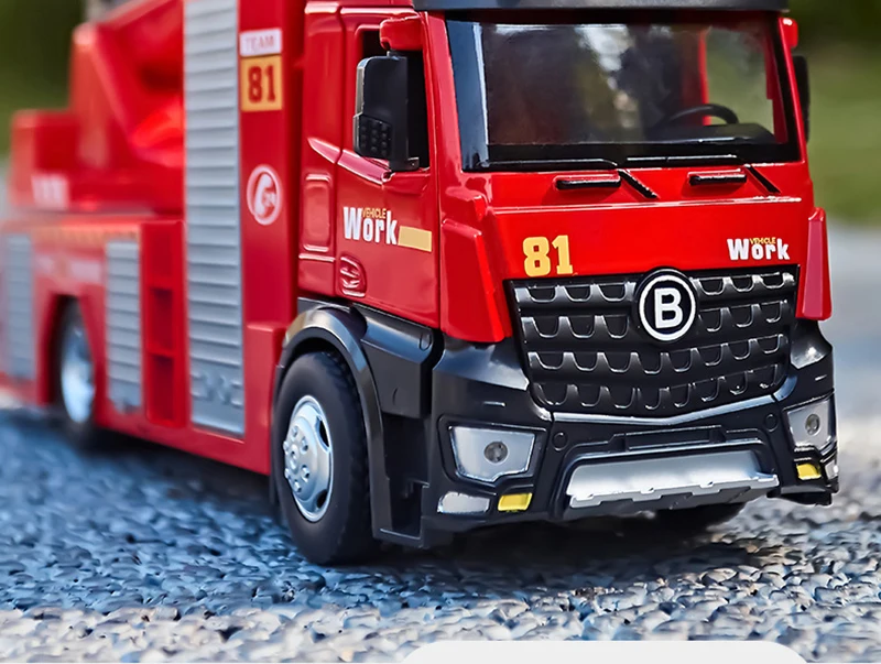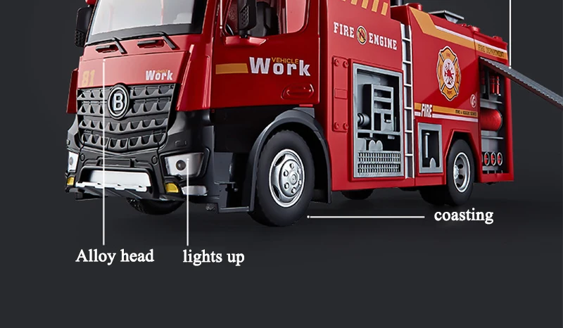Fire truck series, the simulation shape design is scaled down, and the function is rich. Enlighten children's cognition, simulate water spray settings, press the water flow with one button to spray