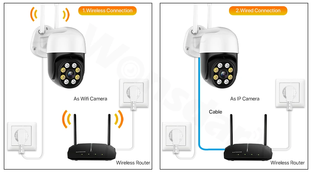 -Вы можете выбрать удобное соединение по своему усмотрению. Иногда у вас может быть только один способ подключения камеры, не волнуйтесь, эта камера поддерживает беспроводное и проводное соединение одновременно.