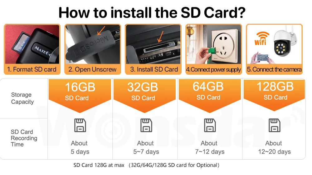 -Вставьте TF-карту до 128 GB (TF можно выбрать по мере необходимости), чтобы сохранить видео, которое вы не хотите удалять