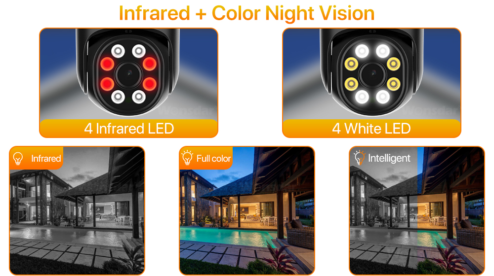 -Оснащенный 4 белыми светодиодами и 4 высокоэффективными инфракрасными светодиодами, он может предоставить вам красочные Эффекты изображения высокой четкости независимо от дня или ночи.