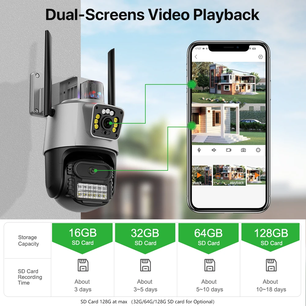 Максимальная запись SD-карты 128 ГБ и запись в облачном хранилище (требуется дополнительная плата), безопасность данных более стабильна. Если вы хотите продолжать использовать Cloud Service, вам просто нужно заплатить за него, если вам не нужно использовать, он автоматически остановит его, когда вы не заплатите за плату.