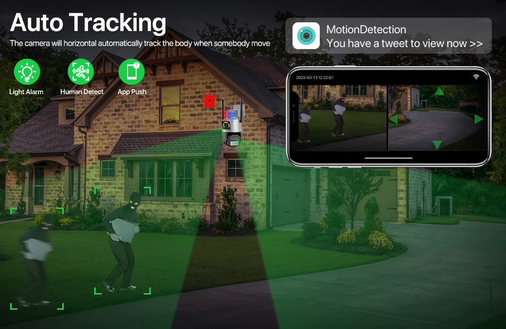 С сигнализацией обнаружения человека и сигнализацией отслеживания движения камера может обнаруживать гуманоида и следить за ним в инфракрасном режиме и режиме цветного ночного видения.