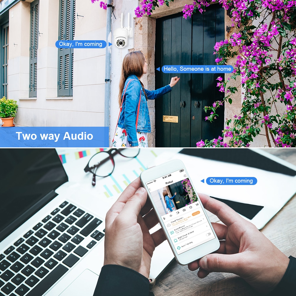 Встроенный микрофон и динамик/Настроенные новые динамики с громкой громкостью; Вы можете поговорить с кем угодно, приближающимся к камере (предупредите кого-то, чтобы он покинул ваш дом).