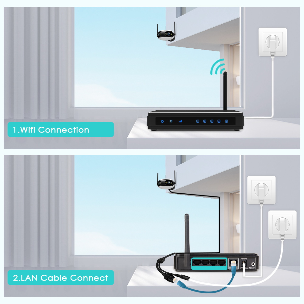 Питание от адаптера DC12V позволяет подключить камеру к сети Wi-Fi. Вы можете настроить Wi-Fi-соединение камеры или поиск по локальной сети с помощью сетевого кабеля, подключенного к маршрутизатору, работать только с Wi-Fi 2,4G (не поддерживает 5G).