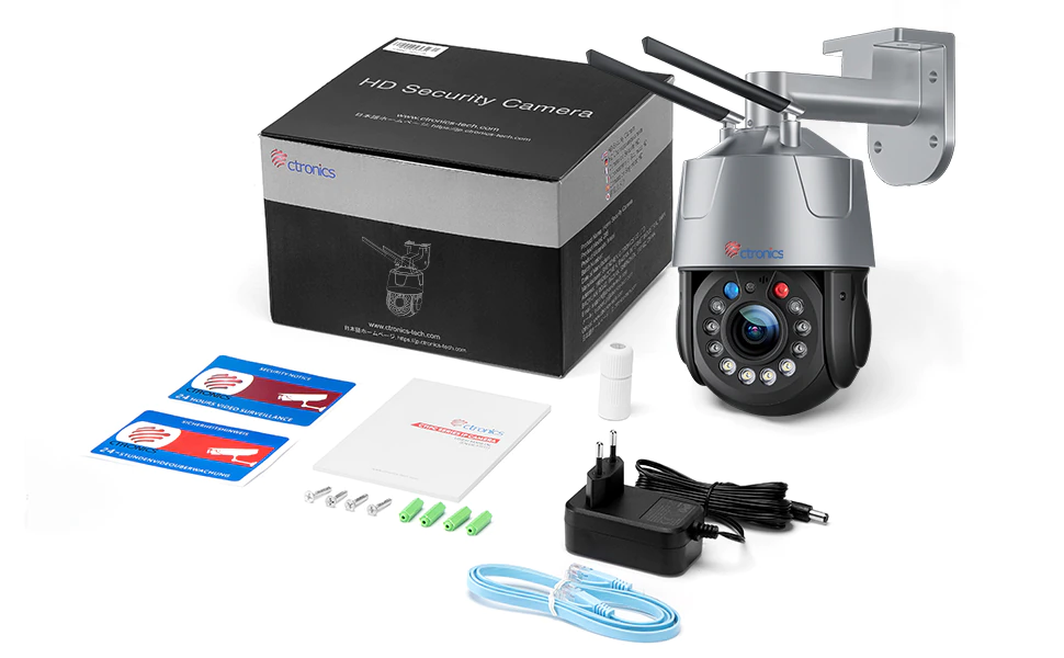 Камера видеонаблюдения Ctronics 5MP PTZ может контролировать и сканировать в любом заданном направлении. Он поддерживает запись круиз-зума и переключение сканирования между различными кратными зуму в любом случае. Он может быть установлен с двумя маршрутами патрулирования, каждый с 16 предустановленными позициями, что означает, что в общей сложности возможно 32 предустановленные позиции.