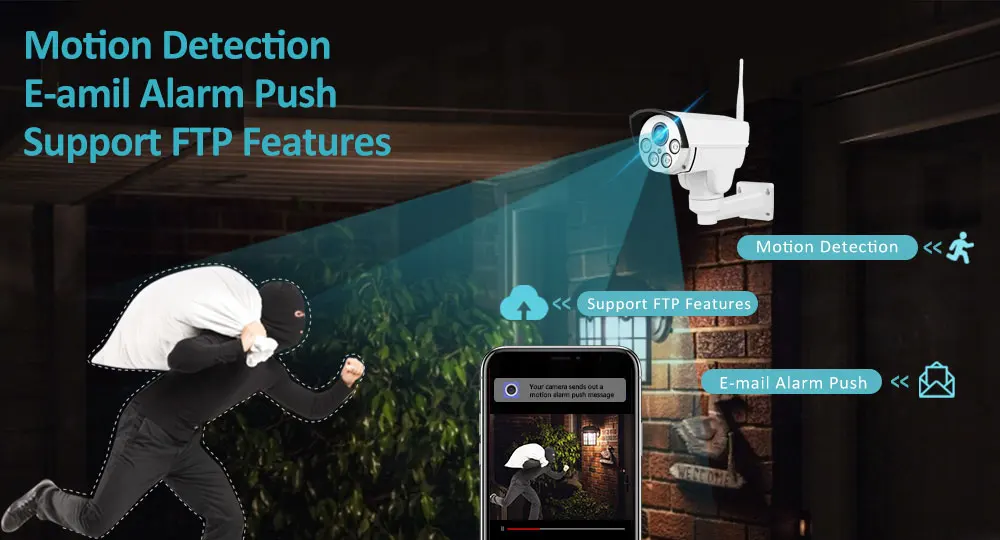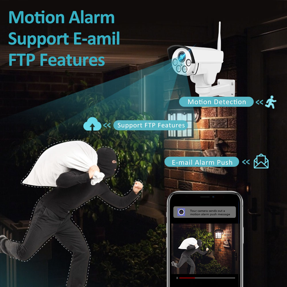При обнаружении движения камера наблюдения немедленно инициирует оповещения, отправляя оповещения по электронной почте и отправляя уведомления на ваше устройство. Он также загружает и сохраняет Захваченные изображения/видео на FTP-сервер.