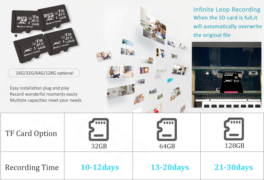 Хранение SD-карты: Поддержка карты Micro SD до 128 ГБ (опция), вы никогда ничего не пропустите, это гарантирует запись всех ключевых событий.