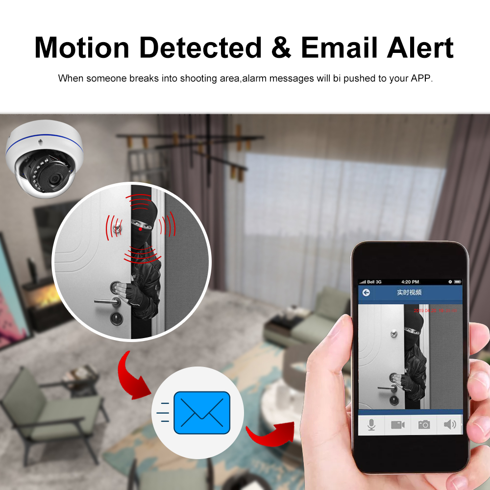 With the motion detection function, the camera is able to detect any movements happened in your house and record it. Any movements can be detected and recorded via the motion detection function and alarming e-mail will be sent timely to leave you enough time for precautions.