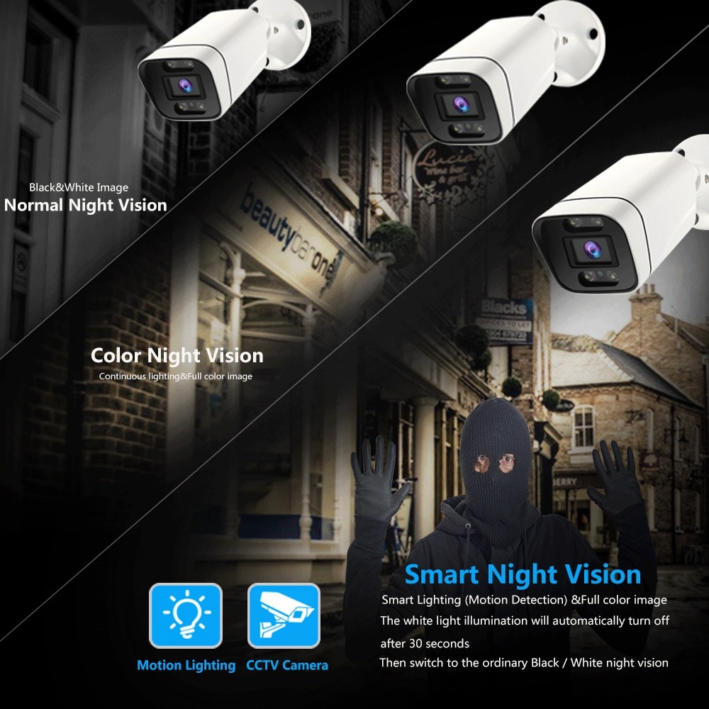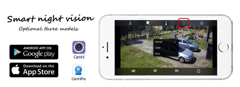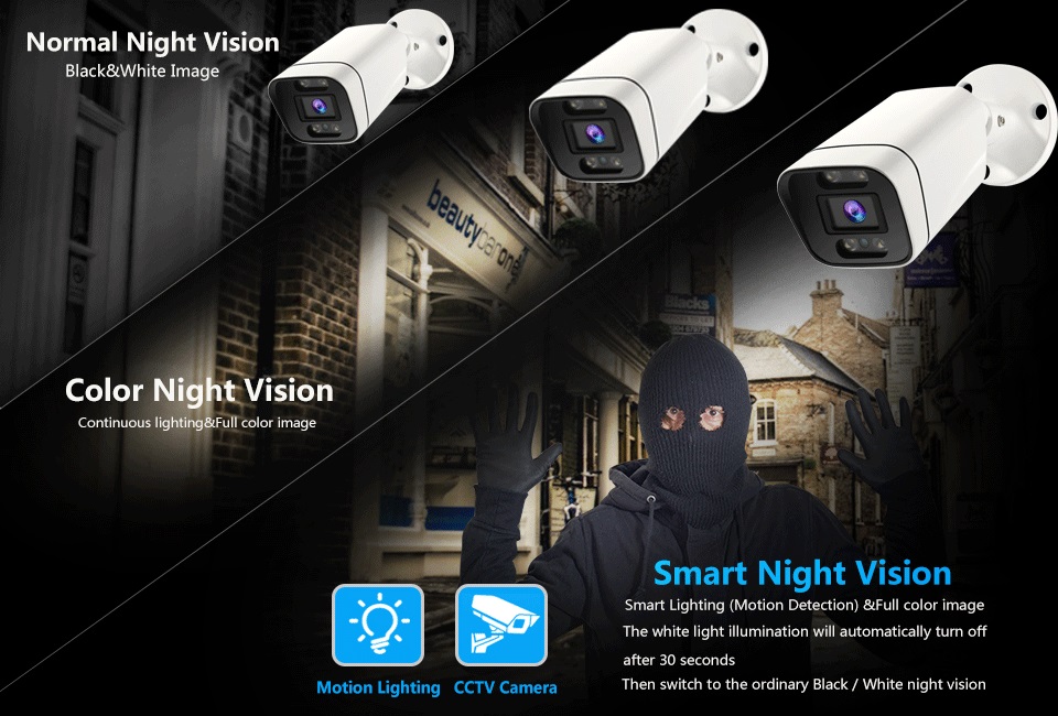 3: Автоматический режим: умное ночное видение. Инфракрасные лампы включены. Обычное черно-белое ночное видение. При обнаружении движения сигнализация. Белые огни горят.