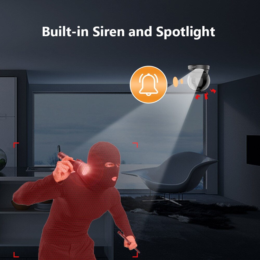 Эта Wi-Fi камера оснащена активным сдерживанием, включая мощную сирена 110 дБ и встроенный прожектор, который может быть запущен вручную.