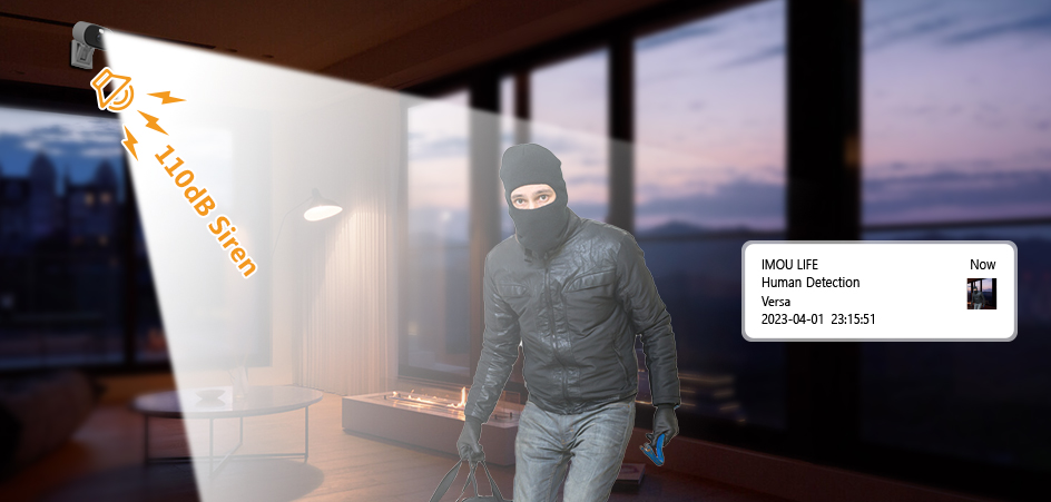 Когда Versa обнаруживает вторжение, встроенные прожекторы и сирена 110 дБ отпугивают нежелательных посетителей и отправляют Вам предупреждение.