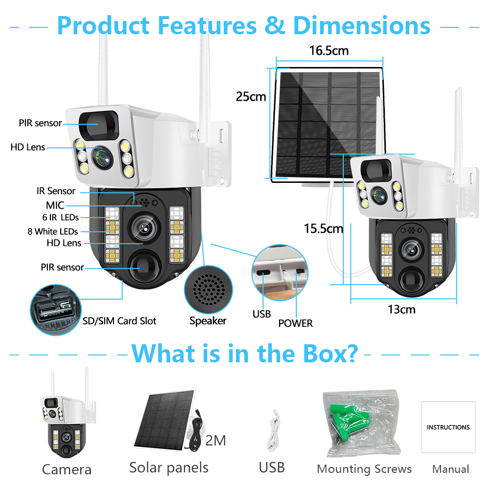 Наша камера оснащена уникальной функцией двойного метода зарядки, которая позволяет вам выбрать солнечную зарядку или зарядку через USB-кабель для удовлетворения потребностей в зарядке в различных ситуациях. Эта функция дает вам большую гибкость и надежность зарядки, гарантируя, что вы всегда будете держать камеру полностью заряженной.